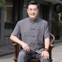 2023新款中国风唐装爸爸装短袖套装中老年男棉麻唐装品牌唐装