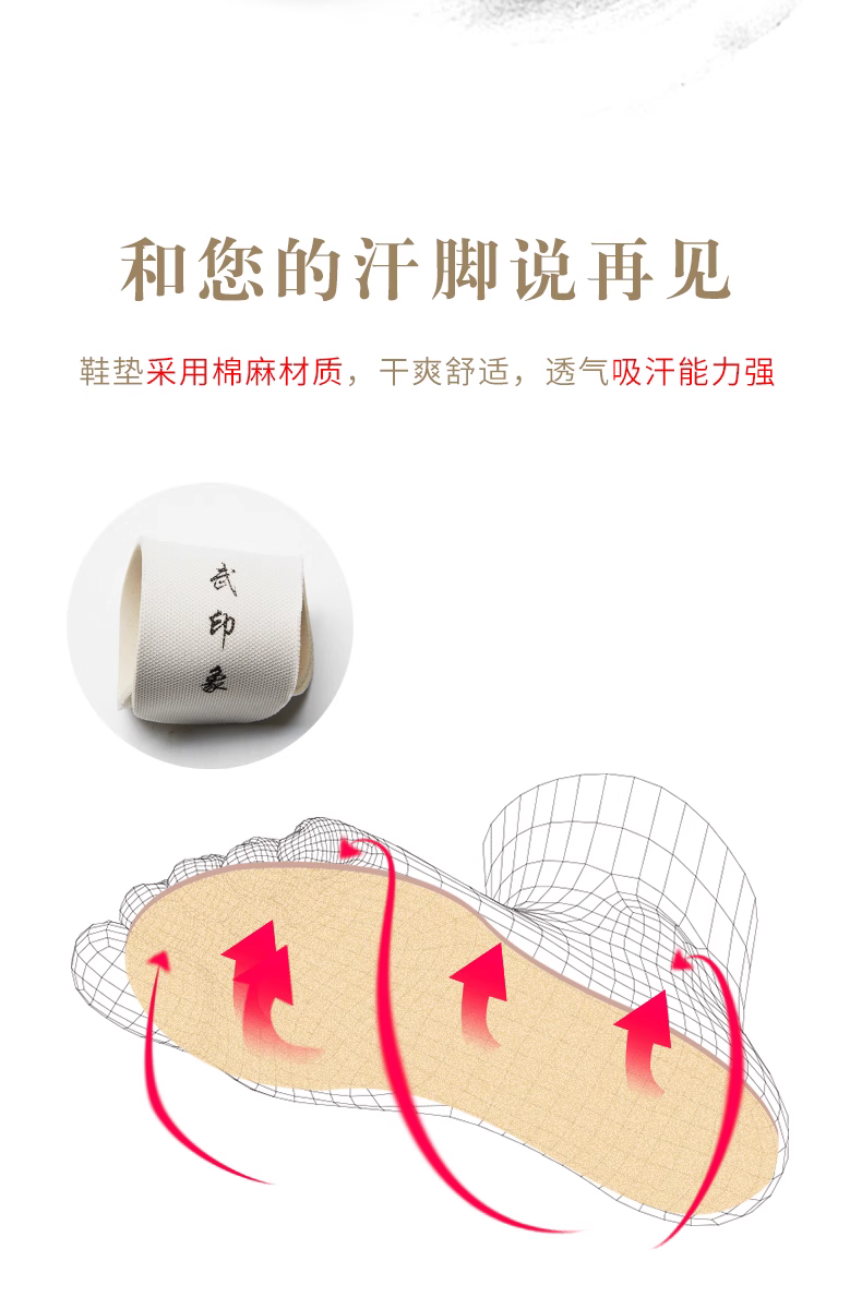 此款太极鞋采用超轻材质,轻如鸿毛,让您健步如飞,鞋面舒适透气,让您的双脚自由呼吸,即使在运动的时候也能保持双脚干燥,告别脚臭异味。鞋垫采用棉麻材质,干爽舒适,透气吸汗能力强。