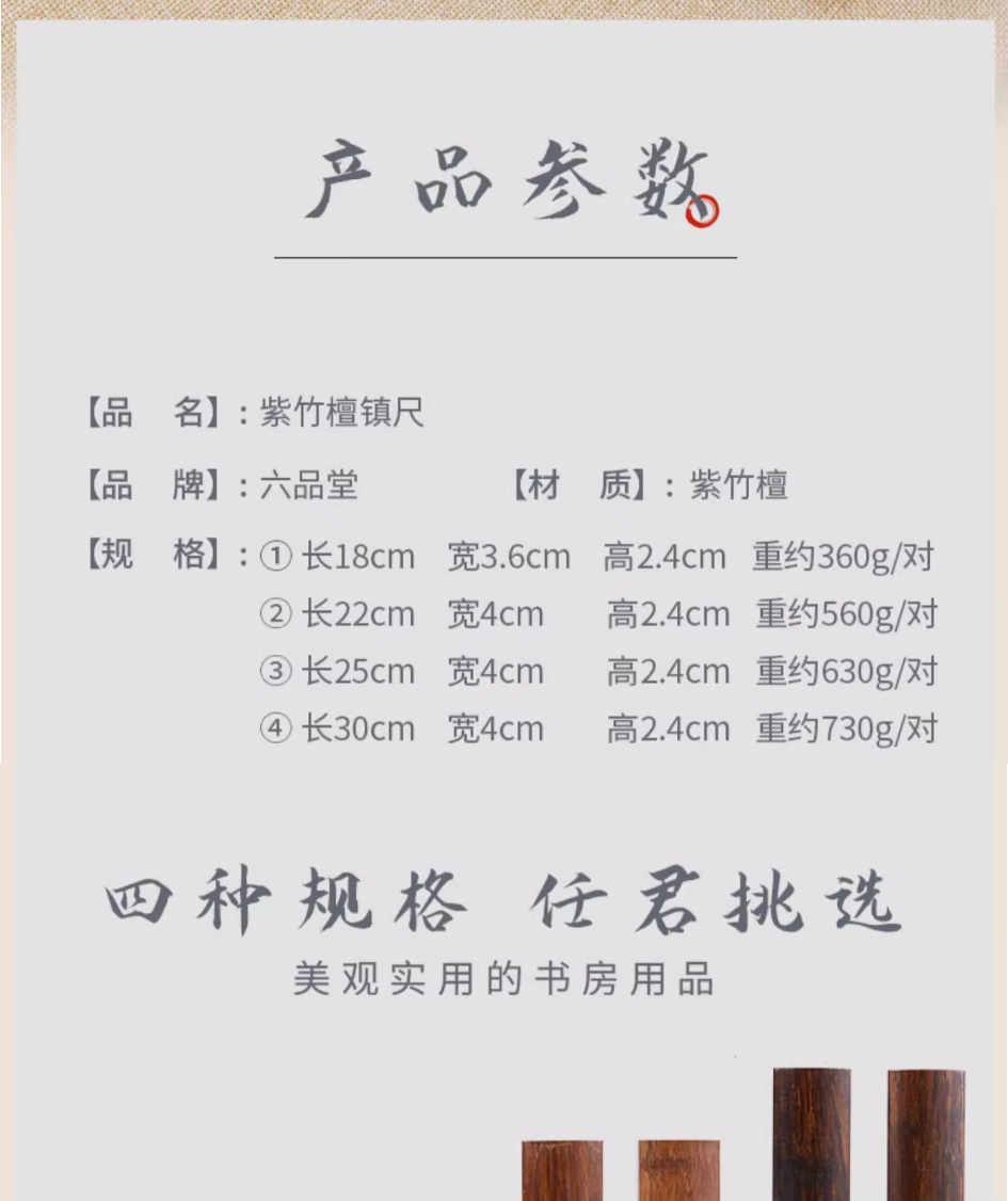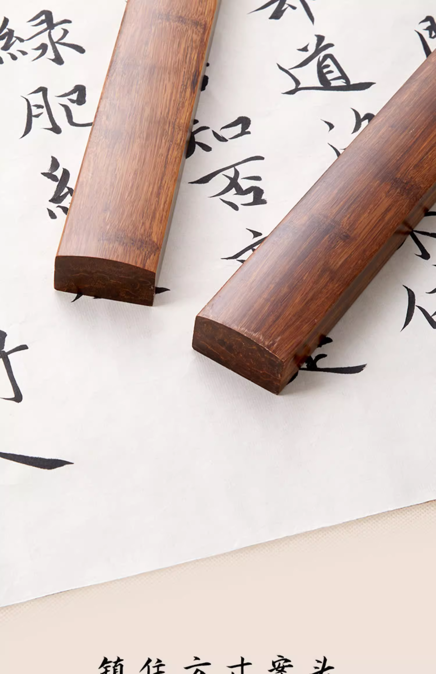这款紫竹檀镇尺是书房中不可或缺的实用品,它采用优质的紫竹檀制作而成,具有高贵典雅的外观和坚固耐用的品质。四种规格可选,满足不同需求。镇尺的设计不仅美观大方,而且能够有效稳定纸张,让您的书写更加流畅。这款产品是书房中一道亮丽的风景线,为您的创作增添一份优雅与宁静。