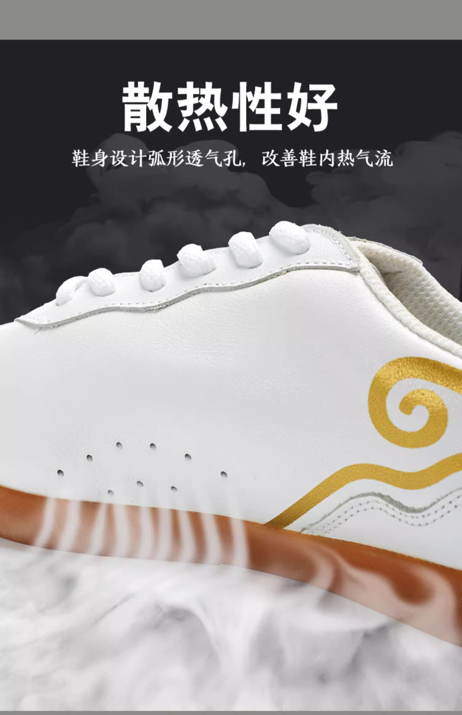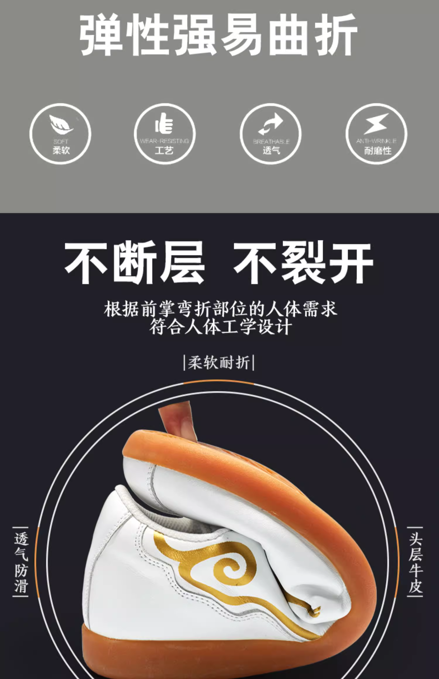 这款太极鞋采用头层牛皮制作鞋面,具有优良的耐磨防滑性能,同时鞋面上的牛皮纹路细腻精致,每一针每一线都经过精心缝制。这款太极鞋是专为太极爱好者打拳设计的,更符合亚洲人的脚型,穿着宽松舒适,让您的运动更加轻松自如。
