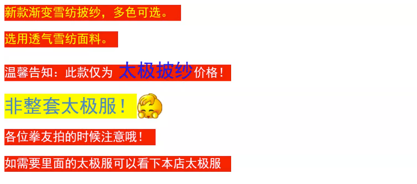 这款渐变色太极服披纱提供五种颜色供您选择,采用透气的雪纺面料。这款披纱将为您的太极服增添一抹独特的色彩,打破单调的视觉效果。其精美的设计将为您的太极练习增添一份优雅与气质。