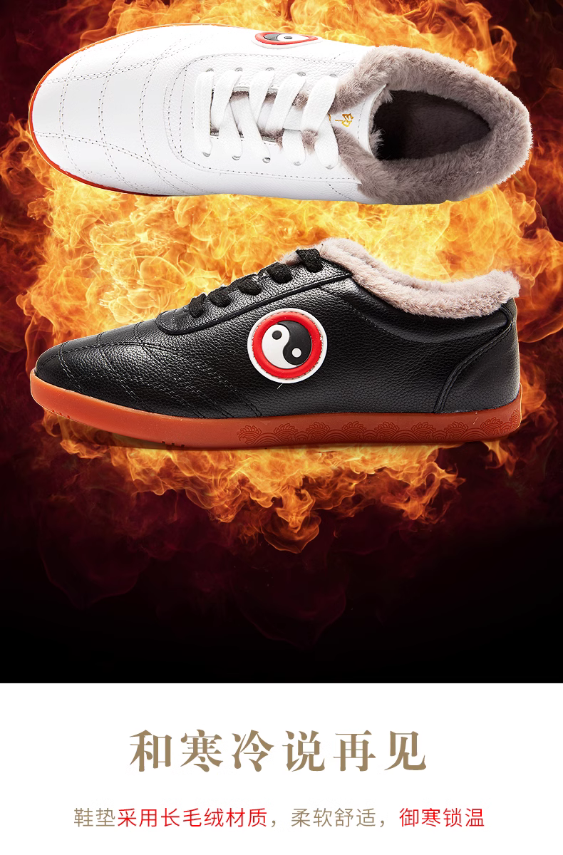 这款秋冬长毛绒牛皮太极鞋,轻盈如同鸿毛,让您在寒冷的冬季打拳时不再感到冻脚。其长毛绒鞋垫柔软舒适,锁温御寒,让您在任何天气条件下都能保持温暖。加厚防滑橡胶底提供稳定的抓地力,有效降低崴脚的风险,让您在运动中更加安心。无论是团队表演还是日常训练,这款太极鞋都能给您带来极致的舒适体验。