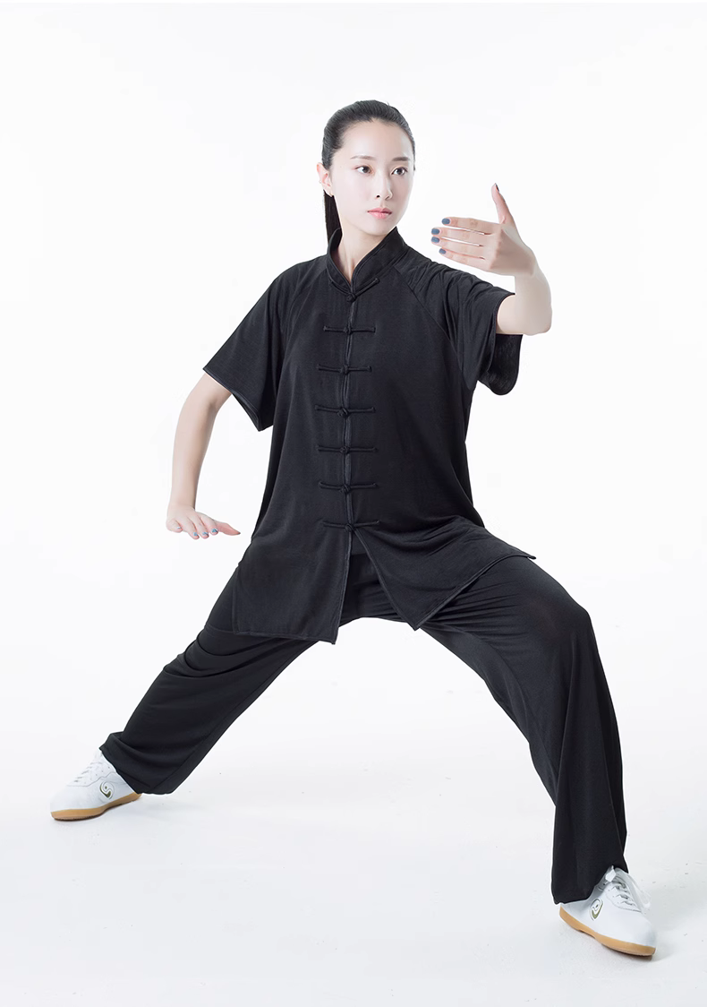 这款夏季清凉款太极服,适合男女穿着,选用冰爽牛奶丝面料,给您带来清凉舒适的体验。独特的针织工艺使得面料具有出色的伸缩性,让您在打太极时动作更加流畅。中式立领设计贴合颈部线条,插肩设计则让您运动自如。加宽松紧腰围,确保您在练习太极拳时穿着舒适,无拘无束。这款太极服是您值得选择的优质产品。