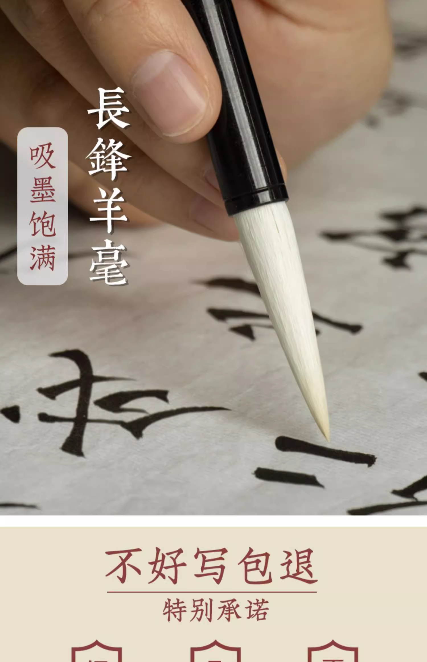 羊毫毛笔的柔软笔头和良好的吸墨性使得它在书法创作中表现出色。当你用它书写时,它可以轻松地吸附墨汁,让你的字迹更加清晰、有力。