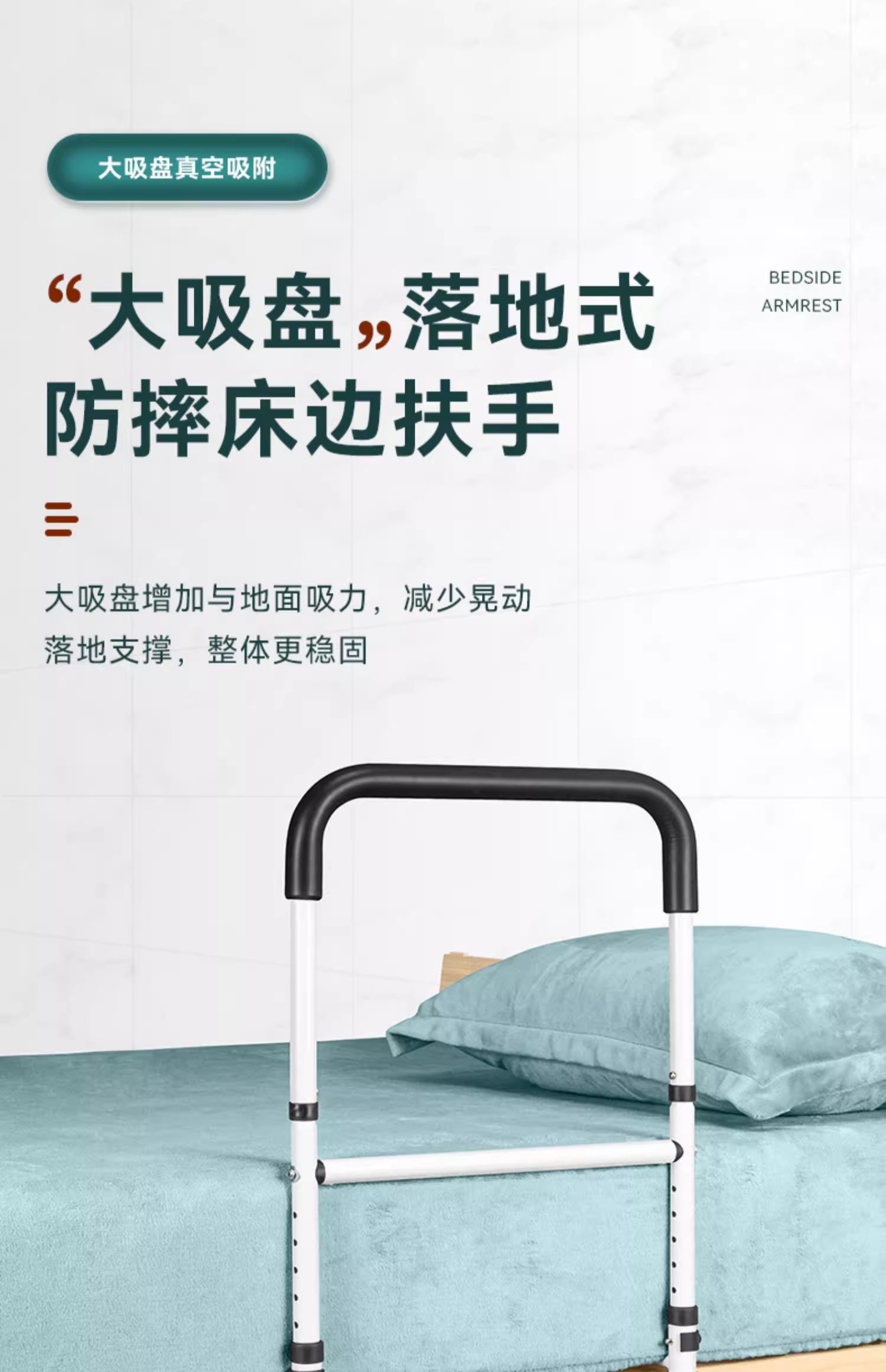 这款床边扶手的设计非常实用,采用大吸盘落地式设计,增加了与地面的吸力,减少了晃动,使得整体更加稳固。这种设计使得扶手在各种地面条件下都能够提供稳定的支撑,非常适合家庭使用。