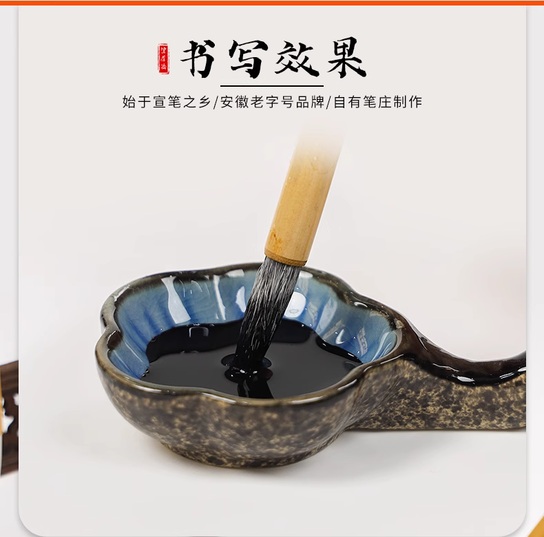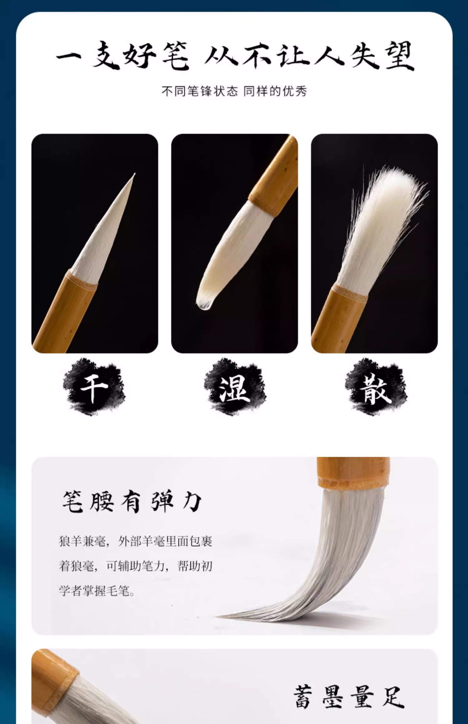这款毛笔采用精选的羊毫制作而成,羊毫是一种相对柔软的毛笔材料,非常适合初学者使用。因为它能够帮助初学者更好地掌控笔画,更容易表现出笔锋和字形。由于羊毫柔软且易于掌控,使得这款毛笔在书写时更加稳定,能够帮助初学者更好地掌握笔画和字形的准确性。