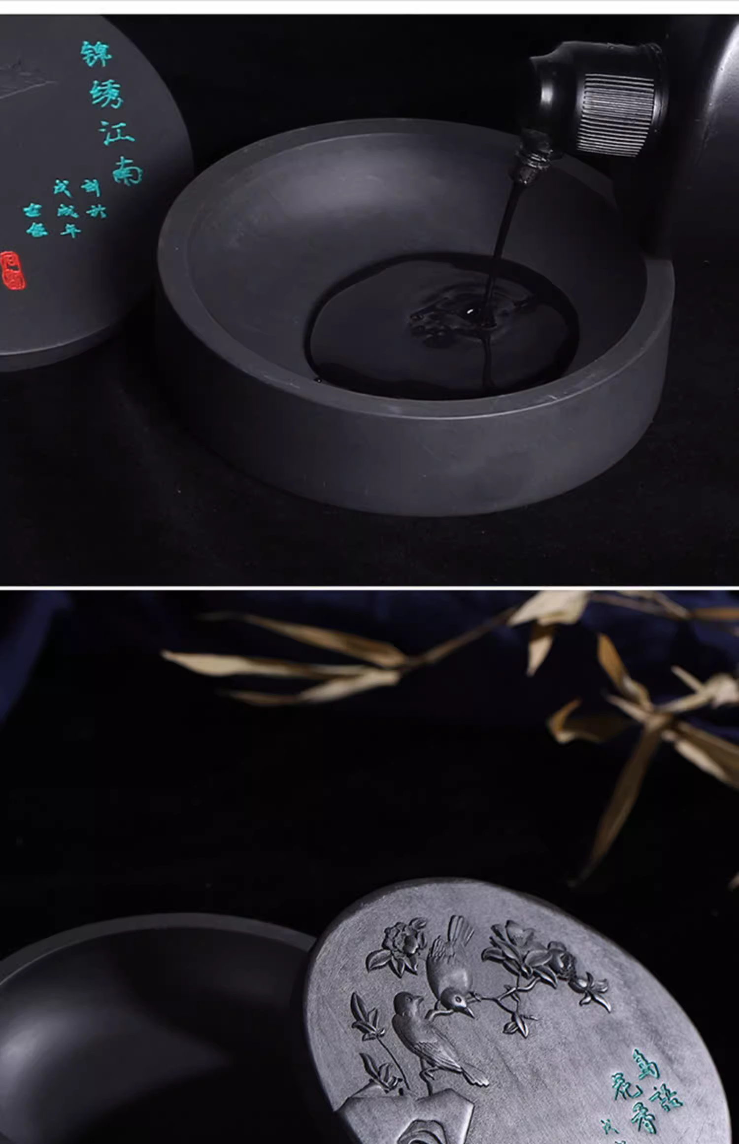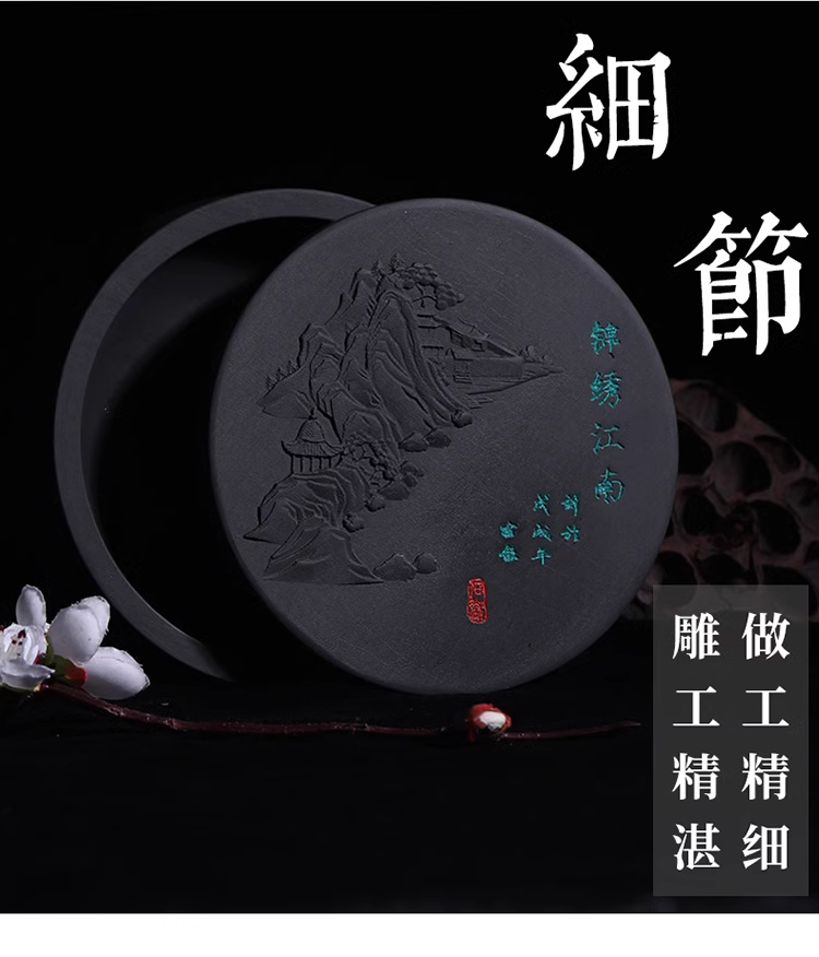 这款砚台的雕刻工艺非常精湛,每一处都流露出中国传统文化的韵味。精湛的雕工不仅让砚台整体更加美观,同时也使其更具艺术价值。虽然砚台的造型简约,但每一个细节都恰到好处。这样的设计使其不仅实用,同时也不失大气。