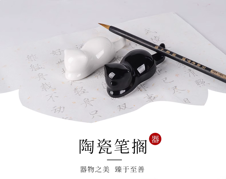 这款多功能陶瓷笔搁是一款创意十足的文具小品,以可爱的猫为造型,不仅能驾笔、镇纸,还可以作为把玩的小萌物,为您的书房增添了一份趣味和活力。