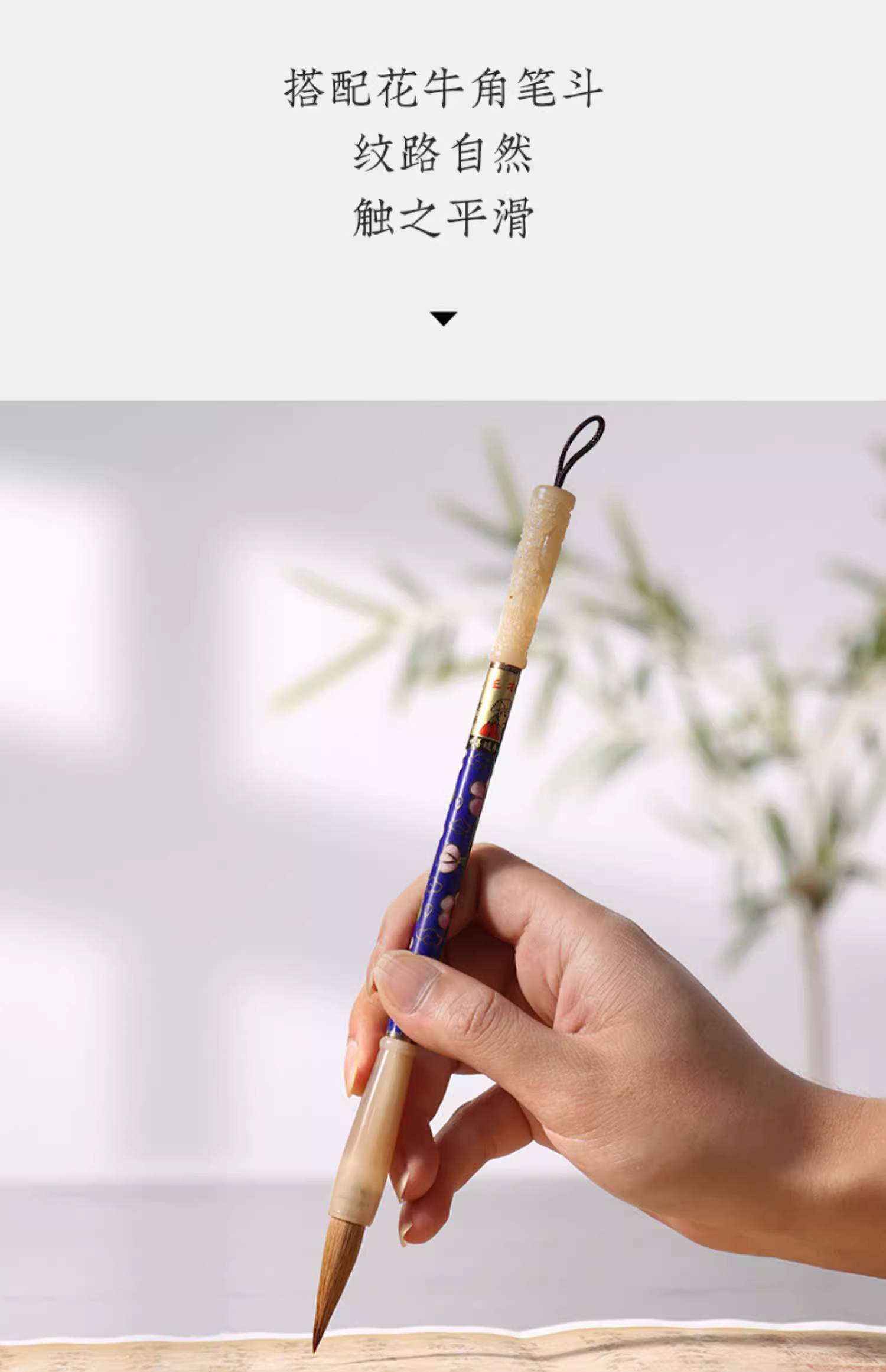 这款毛笔将艺术与工艺完美融合,展现出极致的优雅与品质。笔杆采用景泰蓝工艺制作,精致细腻,美观大方,经久耐用,诠释了传统工艺的精髓。笔斗则选用珍贵的花牛角材料制作,触感舒适,质地坚韧,为书写者提供了极致的使用体验。