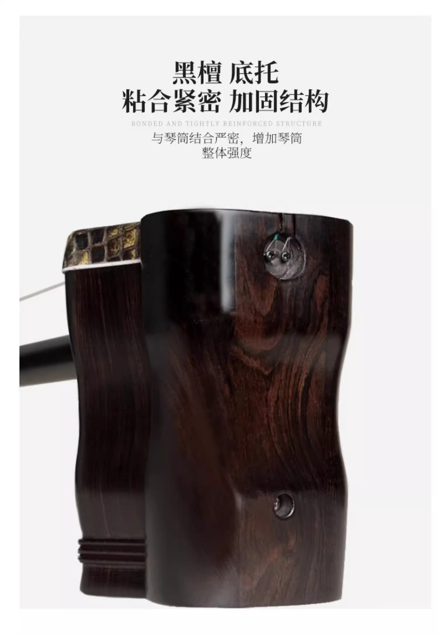 此款二胡乐器选材非常讲究,选择高品质的紫檀木作木材,木材具有优秀的音色传导性和稳定性,能够为二胡的音质提供坚实的基础。此外,制作过程中还涉及到许多复杂的工序,包括开料、制作、蒙皮、雕刻、打磨和调音等,每道工序都需要精细的手工操作和严格的品质控制,以确保最终产品的品质和音色达到最佳水平。