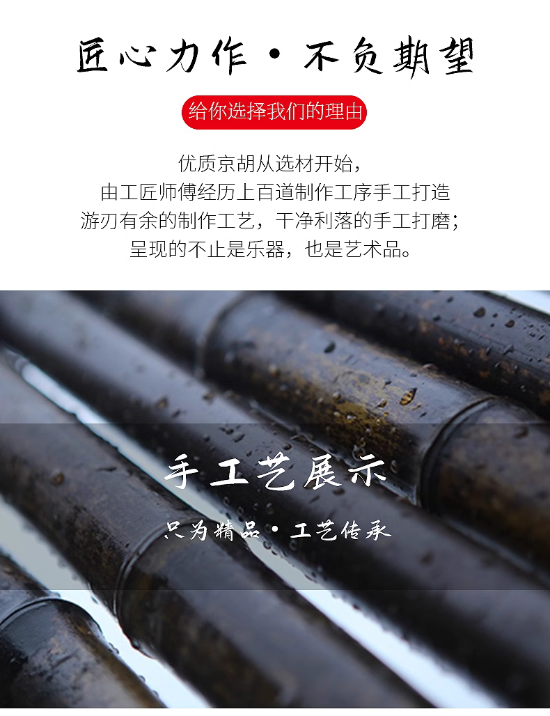 优质的京胡是从选材开始,经历上百道制作工序,由工匠师傅们手工打造而成。在制作过程中,工匠们游刃有余的技艺和干净利落的手工打磨,使得每一把京胡都成为了一件精美的艺术品。这些京胡不仅具有卓越的音乐性能,还以其精湛的制作工艺和美观的外观,展现了中国传统文化的独特魅力。