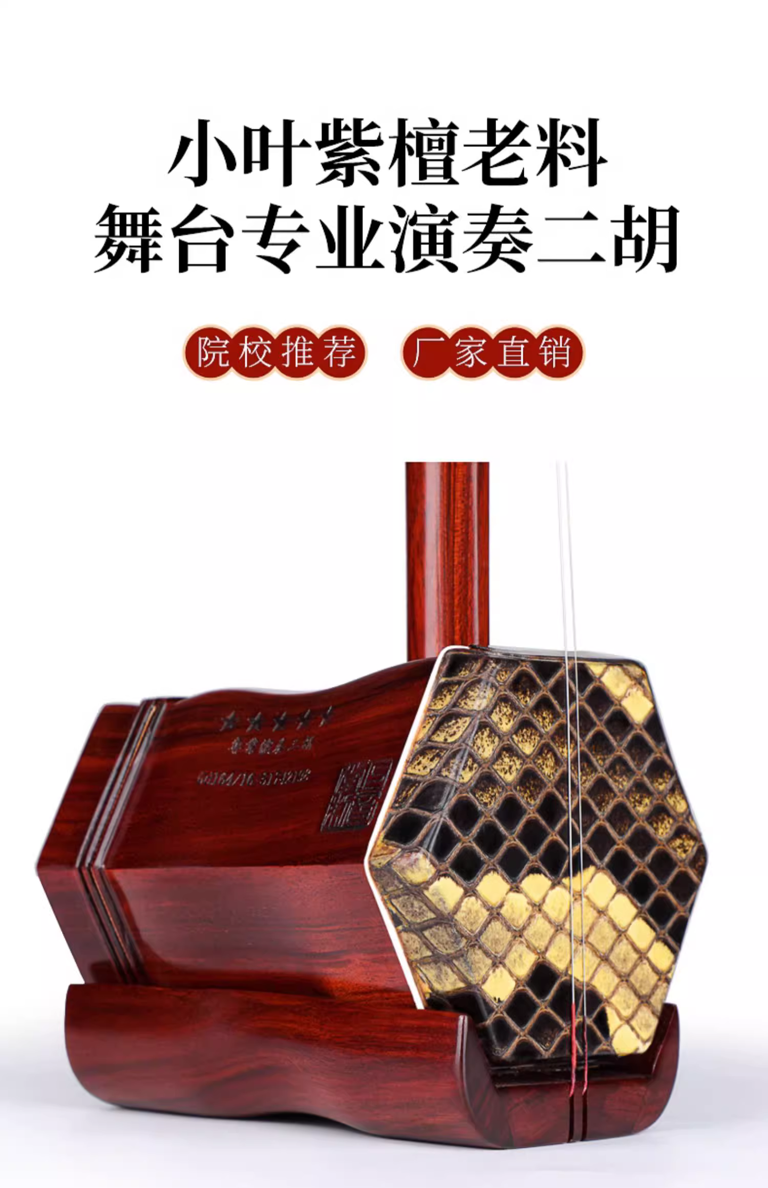 这款舞台专业演奏二胡采用了优质的小叶紫檀老料,经过精心挑选和手工制作,不仅外观典雅高贵,而且具有极佳的音质和弹性。