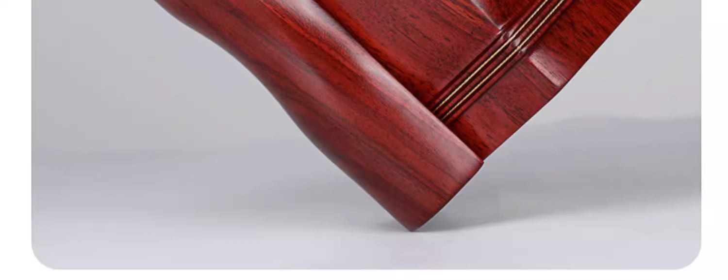 琴筒的材质采用了精选的紫檀木老料,经过自然阴干四年以上,水分充分风干,不易开裂。六块筒材松紧一致,使得发音更均衡、共振更好,声音浑厚圆润。