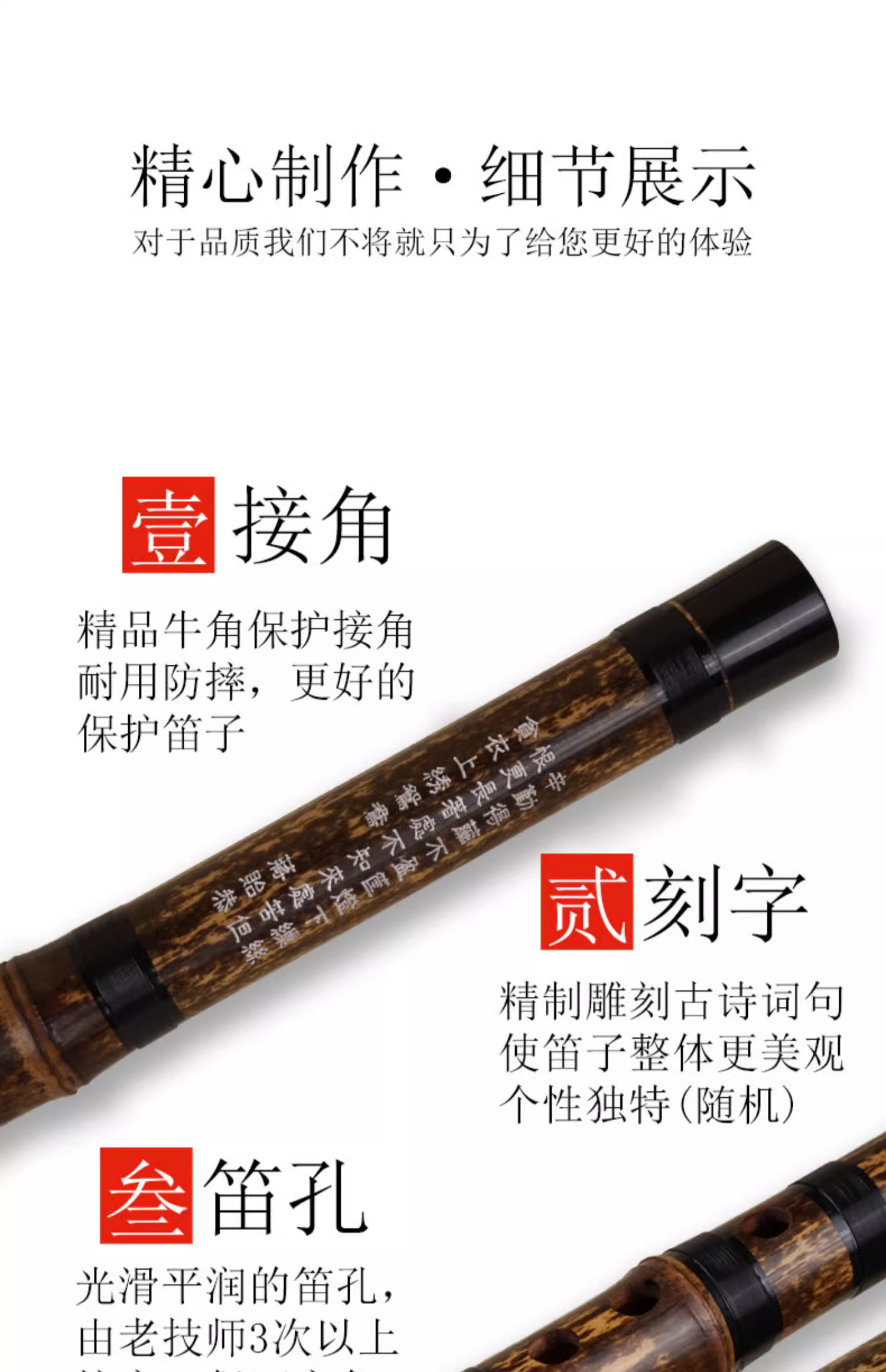 这款专业演奏笛子采用了四年以上紫竹老料制造而成,经过烘烤风干和自然风干的处理,使得竹材的稳定性更好,音质更加清晰。光滑平润的笛孔由经验丰富的老技师经过三次以上的校音,确保音色和音准都达到了极佳的水平,使得吹奏时更加顺畅,同时也更具表现力。