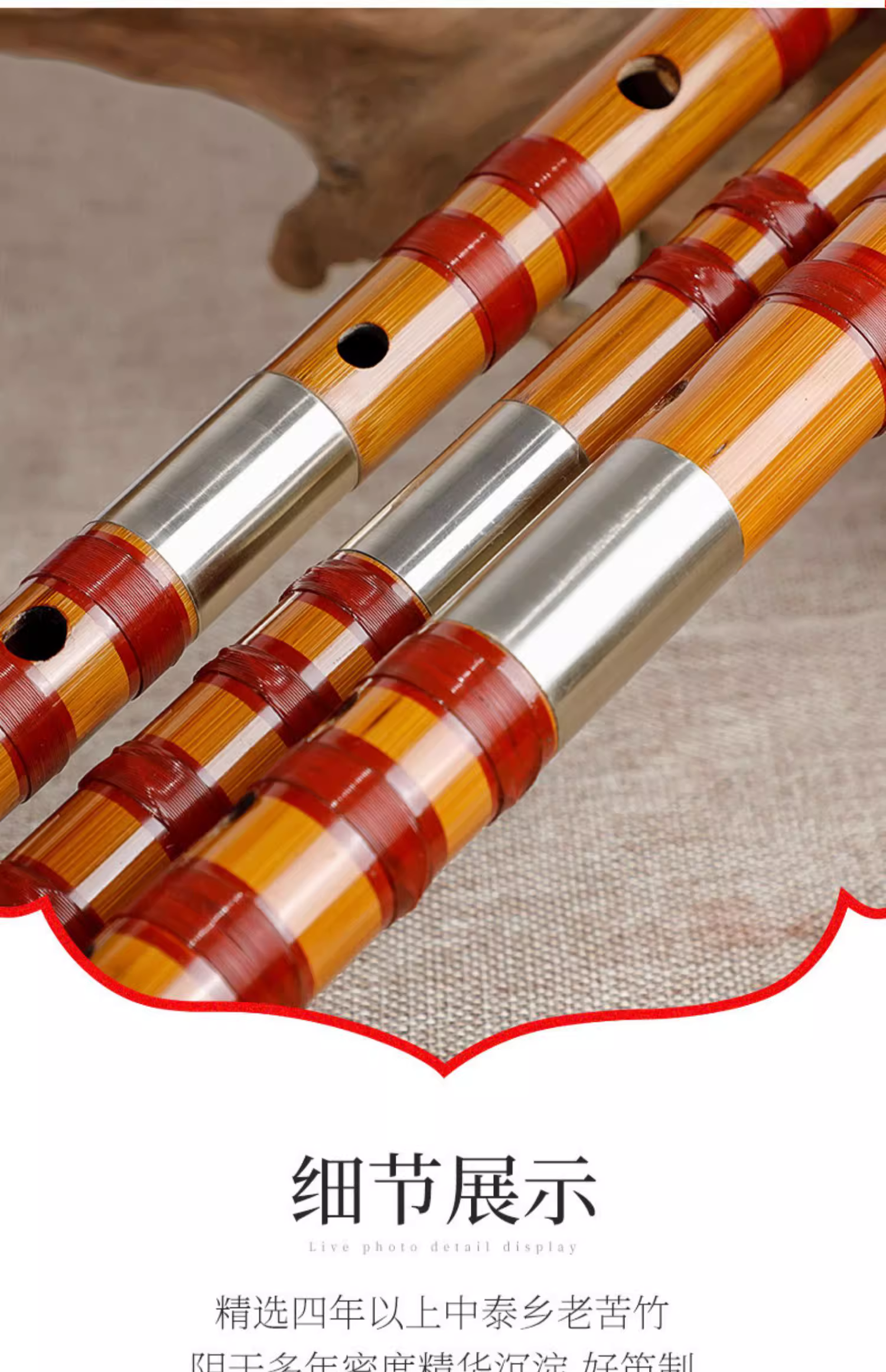 这款精致演奏苦竹笛子选用了来自泰乡的优质苦竹,每根竹材的竹龄都在四年以上。为了确保竹材的质量和稳定性,选用的竹材都要经过阴干处理。在制作过程中,每一只笛子都要经过三次以上的校音,以确保音准和音色的完美。