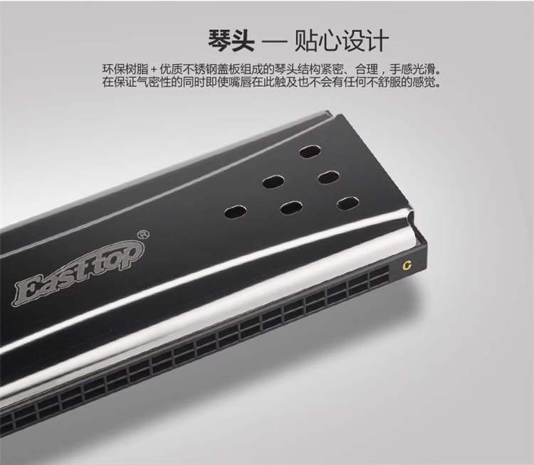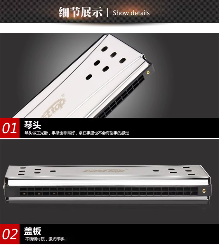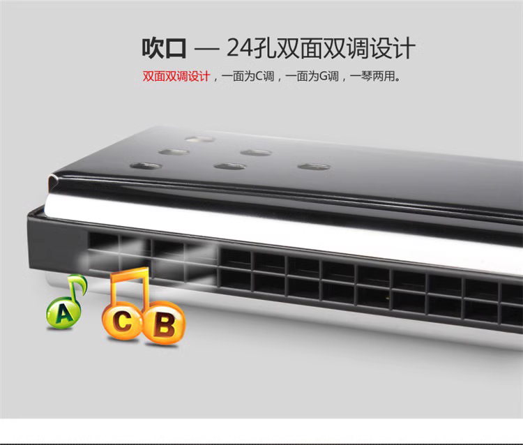 这款24孔口琴采用双面双调设计,使得演奏者可以根据不同的音乐风格进行吹奏,同时优选不锈钢材料制作琴格,强度高,不易变形,更加耐用。琴头部分做工光滑,手感非常好,使得演奏者在使用时更加舒适。