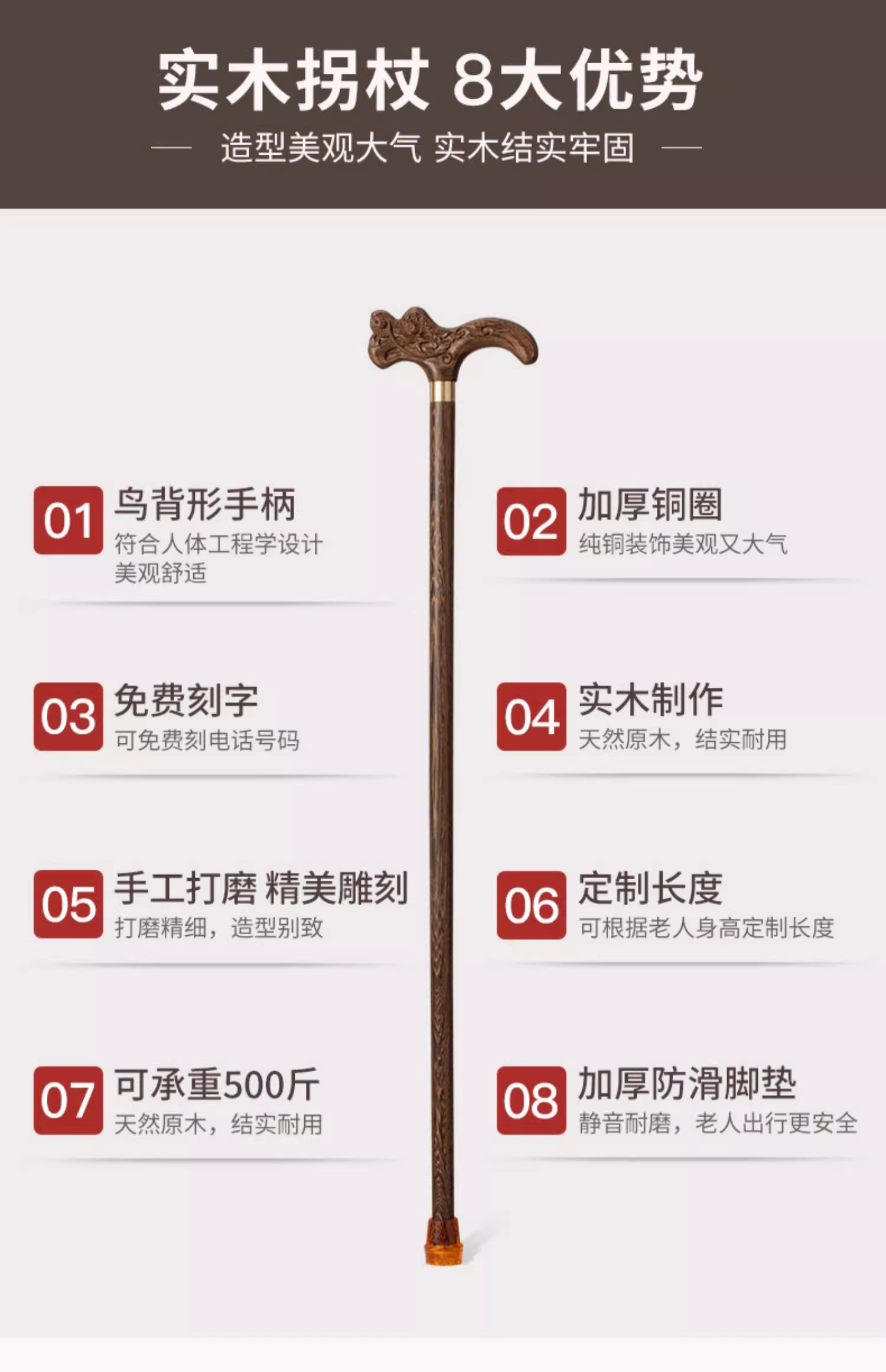 拐杖的雕刻工艺精湛,图案栩栩如生,给人一种立体感和艺术感。手柄部分的设计符合人体工程学,能够提供舒适的手感,让使用者在行走时感受到稳定的支撑。