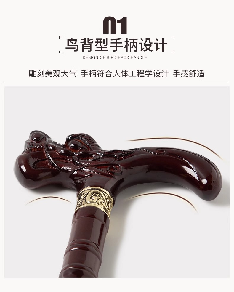 这款紫檀色实木老年人拐杖外观高端大气,轻便且静音,是老年人出行的理想伴侣。它采用优质的实木材料制成,呈现出独特的紫檀色和纹理,给人一种高贵、典雅的感觉。