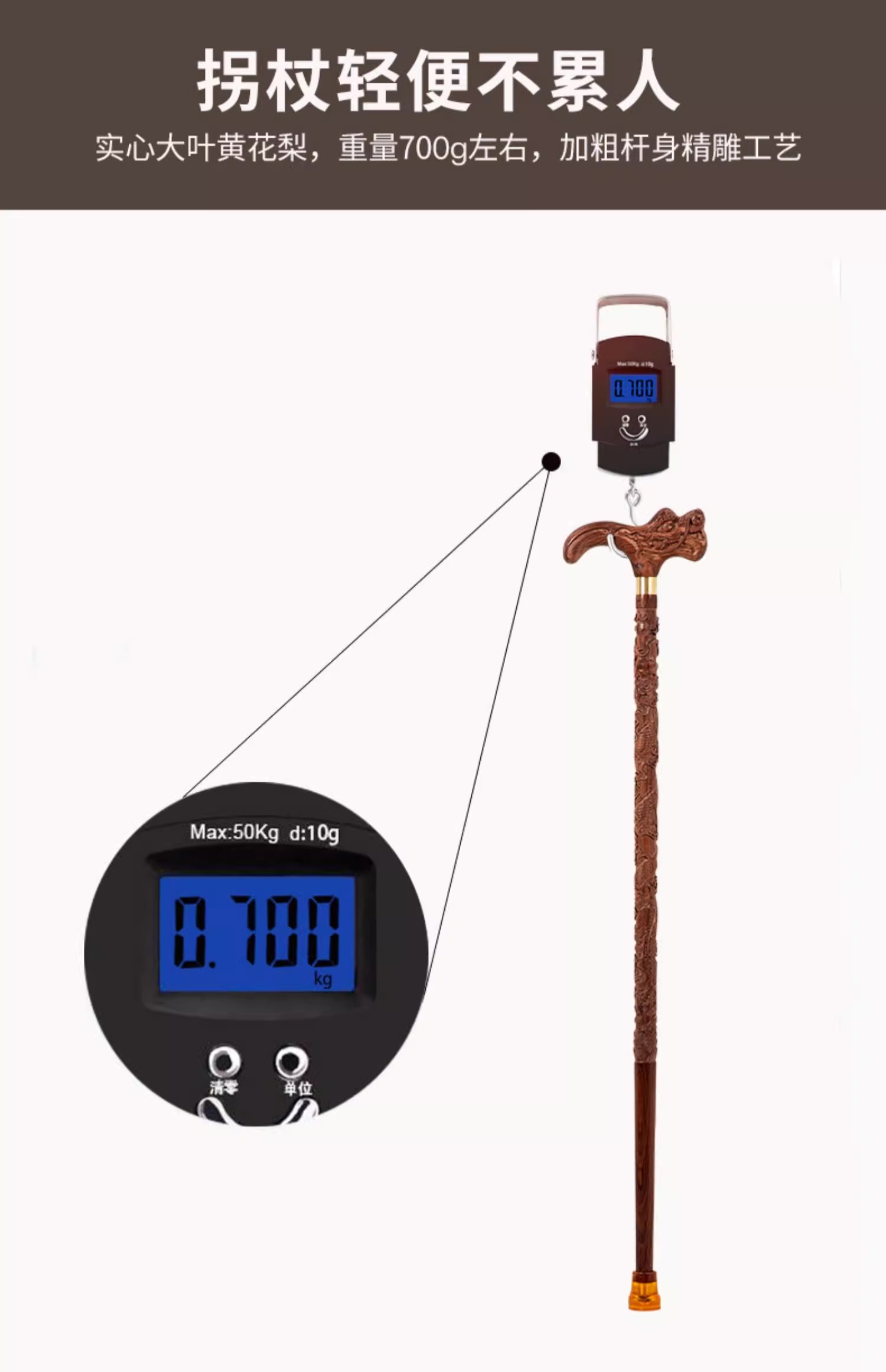 拐杖的顶部有一个全雕龙头,非常精致,能够增加拐杖的稳定性和平衡性。龙头部分还配有防滑垫,可以防止拐杖在湿滑的地面上滑动,确保老年人的安全。