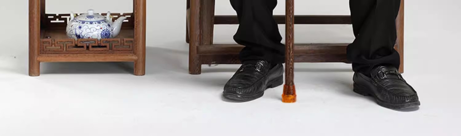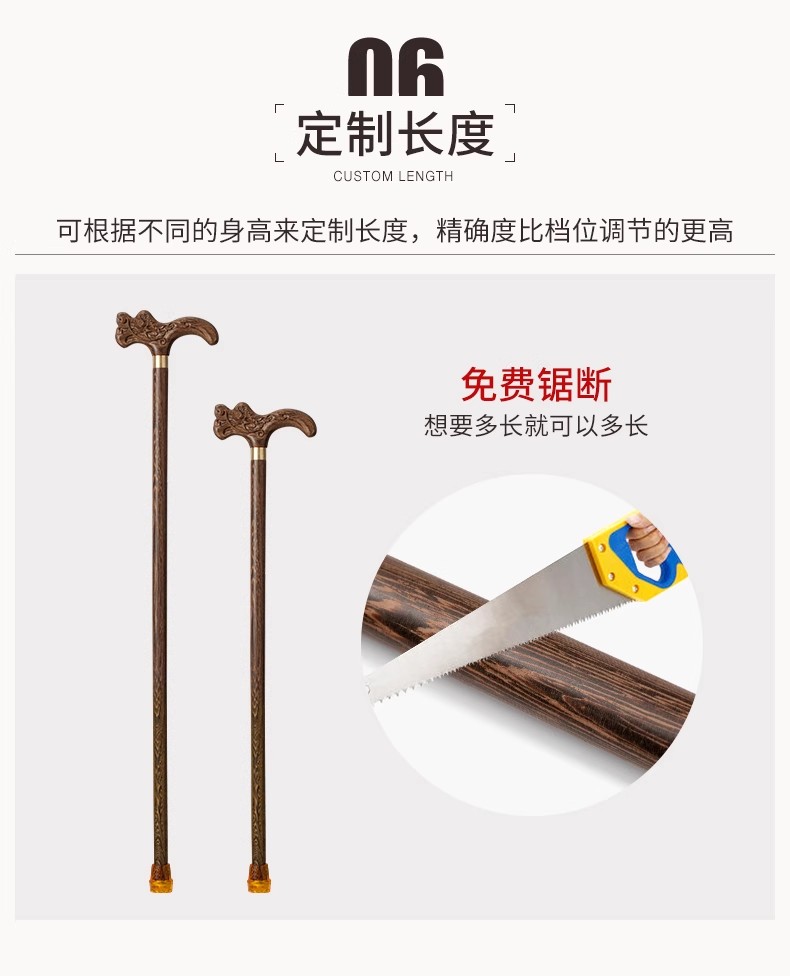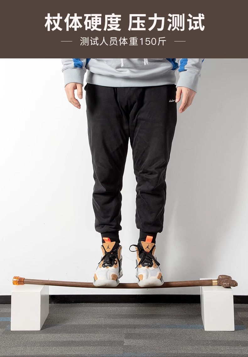 拐杖的把手部分采用鸡翅木制成,这种木材具有独特的纹理和颜色,经过精细的工艺处理后,表面非常光滑,手感非常好。拐杖的顶部有一个龙头雕刻,非常精致,不仅美观,而且可以增加拐杖的稳定性和平衡性。拐杖的底部配有防滑垫,可以防止拐杖在湿滑的地面上滑动,确保老年人的安全。