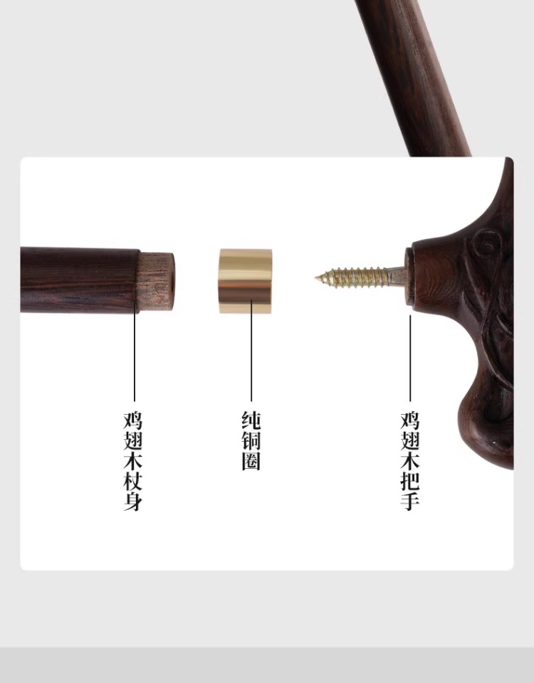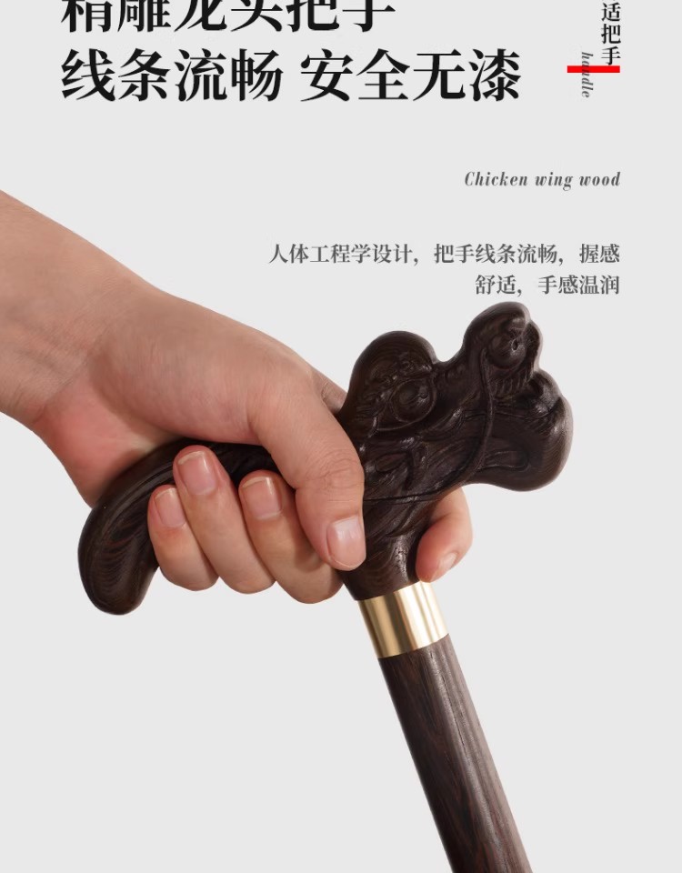 这款龙凤情侣款黑鸡翅木拐杖,选用珍贵的黑鸡翅木制作,天然原木材质,精工雕刻,既美观又实用。拐杖的设计便捷省力,可以轻松出行。手柄部分采用人体工程学原理设计,握感舒适,不易滑落,为使用者提供安全的扶助。