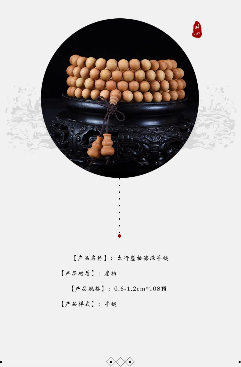 崖柏木是一种珍贵的木材,具有独特的纹理和色泽,经过精心打磨和抛光后,表面呈现出润泽的光泽和细腻的质感。108颗珠子的设计寓意着吉祥如意、祈福纳祥的美好祝愿。