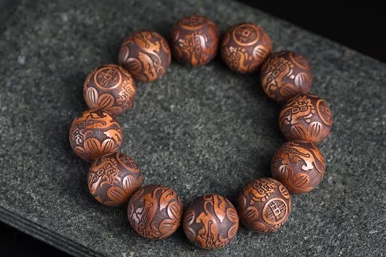 此款是非洲黄花梨木手串,灵珠有形,意无形,12颗精雕刻珠,复古而大气。手串共有12颗珠子,每一颗都经过精心挑选和打磨,表面光滑如镜,散发出迷人的光泽。整体造型复古而大气,灵珠有形,意无形,寓意着吉祥如意、幸福安康的美好祝愿。