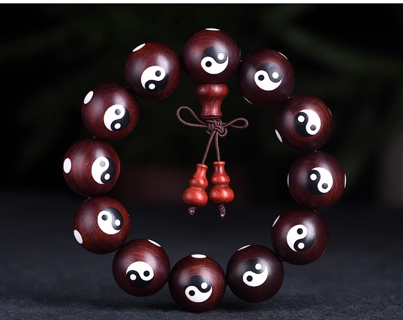 小叶紫檀是一种珍贵的木材,具有深紫色的美丽纹理和天然的芳香。经过匠人的精细制作,这款手串的每一颗珠子都呈现出完美的形态和质地。而嵌入的树脂八卦,更是增添了这款手串的特色,既保持了小叶紫檀原有的高贵气质,又融入了现代的设计元素。