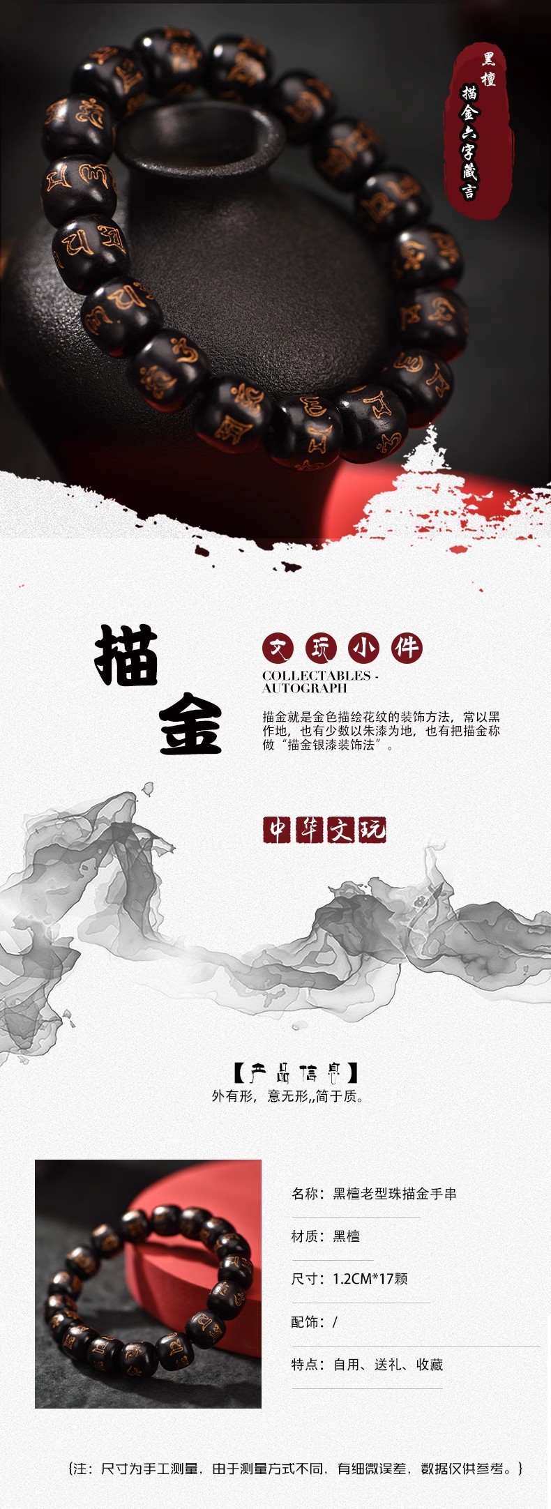 这款老型珠描金手串采用高品质的黑檀材质,经过手工打磨,线条流畅,细腻且充满质感。手串的色泽红艳莹透,油怀充足,展现出黑檀独特的美丽。