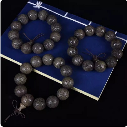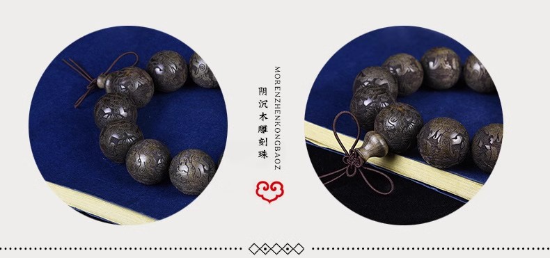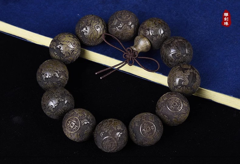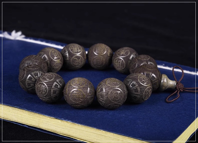 此款金丝楠木阴沉木激光雕刻手串是一款充满艺术气息的手串饰品。它采用珍贵的金丝楠木制成,呈现出深褐色和独特的纹理。手串上运用激光雕刻技术,将精美的图案和文字雕刻在木头上,使得每一颗珠子都显得格外独特。