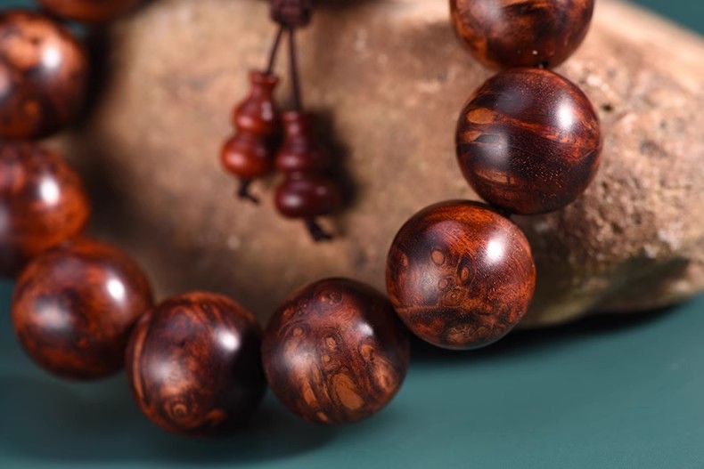 手串上的瘤疤是血檀在生长过程中因外界伤害而形成的疤痕,这些疤痕结痂后形成了独特的纹理和图案。这些瘤疤具有高油密度、纹理繁复美艳、稀缺性强的特点,是血檀中的上品。