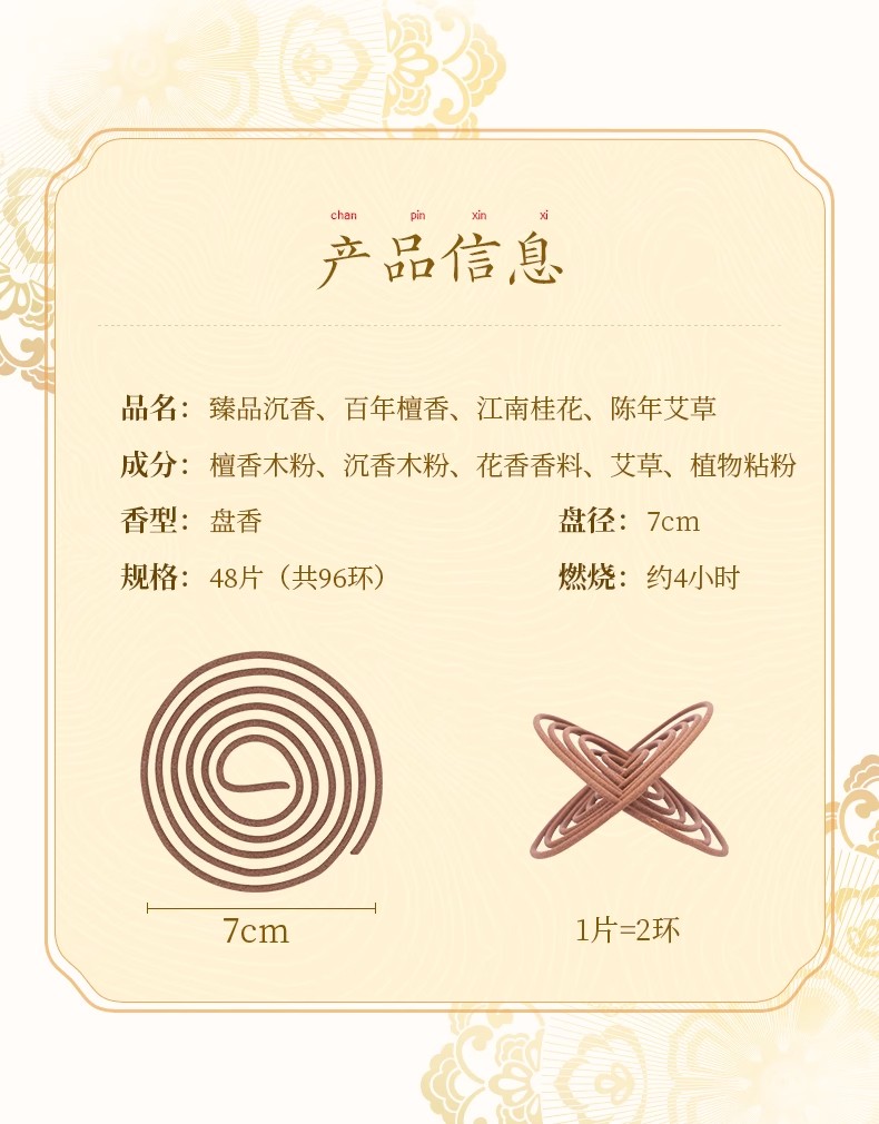 这款沉香盘香,每一罐都能让您体验到四小时的持久香气。其大容量的设计,让您在享受香气的同事,也能感受到它的实惠。我们的香材源自源头,保持原木本色,为您提供最纯粹的体验。产区正选,香气自然纯粹,让人爱不释手。选用树龄五十年以上的檀香,清雅甘甜,久闻不腻,让您沉醉其中。
