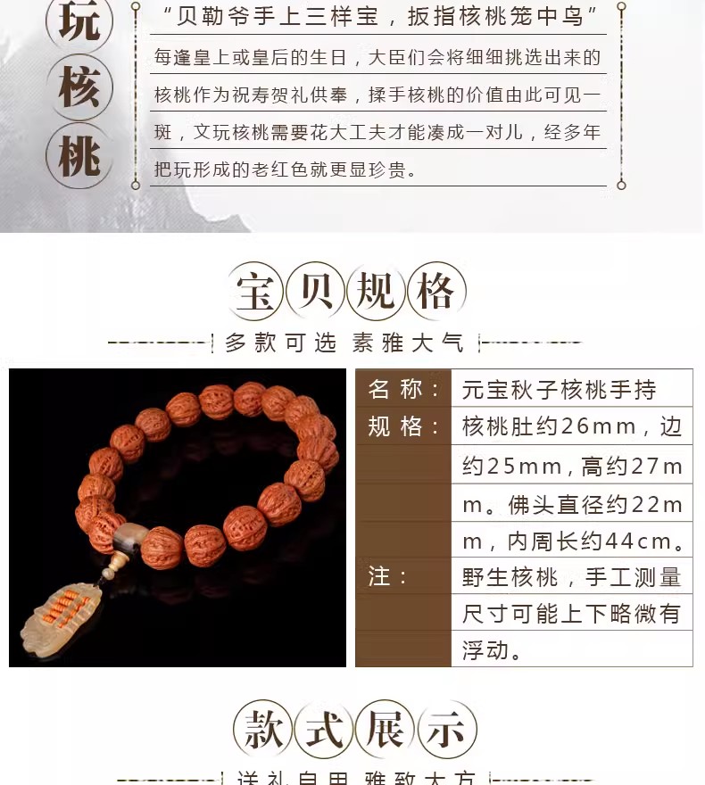 这款元宝秋子核桃手持采用高抛工艺,质地坚硬,手感顺滑,呈现出独特的金属光泽。每颗核桃都经过精心挑选和加工,确保纹理和形状的对称性,增加了整体的观赏价值。此外,这款手持的配饰采用高质量的材料制作,精致的设计使其更具时尚感和质感。无论是自用还是送人,都是一个不错的选择。