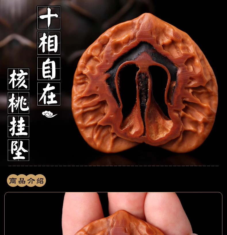 这款十相自在核桃挂坠是一款非常精美的文玩饰品,纹理非常清晰细腻,肉纹饱满,给人一种非常真实的感觉。这种纹理不仅美观,而且让这款核桃挂坠非常容易识别和欣赏。