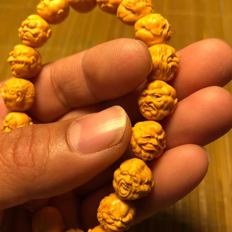 这款手串采用了雕刻技艺,将十八罗汉的形象栩栩如生地刻画在桃核上。雕刻师精湛的技艺使得每个罗汉的面部表情、服饰纹理以及动作姿势都刻画得非常细腻,展现出一种独特的艺术魅力。