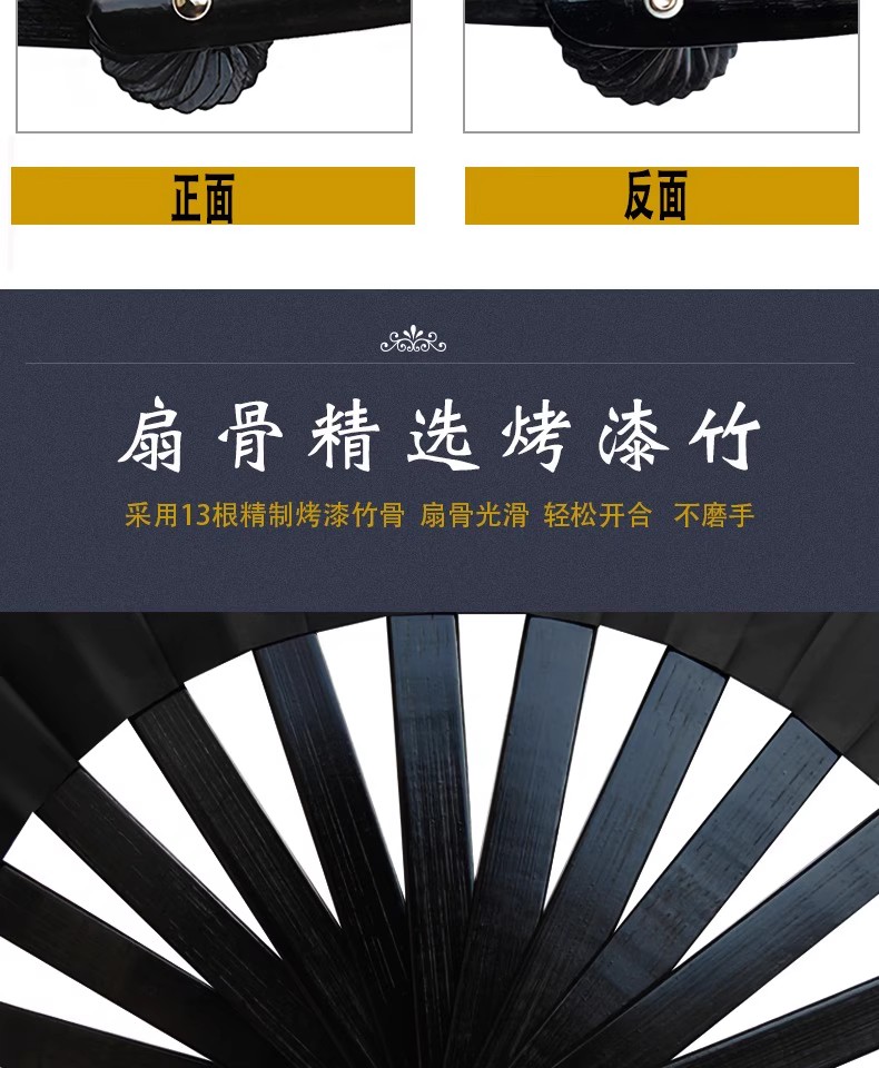 这款功夫扇采用了扇轴防散架设计,使得扇子在使用过程中更加稳定和耐用。实心钢钉具有抗氧化、不生锈的特性,使得扇子在使用过程中能够保持美观和耐用。扇骨精选考漆竹,这种材料具有较高的硬度和韧性,能够提供更好的支撑和耐用性。扇面采用优质绸布,颜色均匀,经过电脑整理裁剪,烫边工艺处理,使得扇子的外观更加精美。