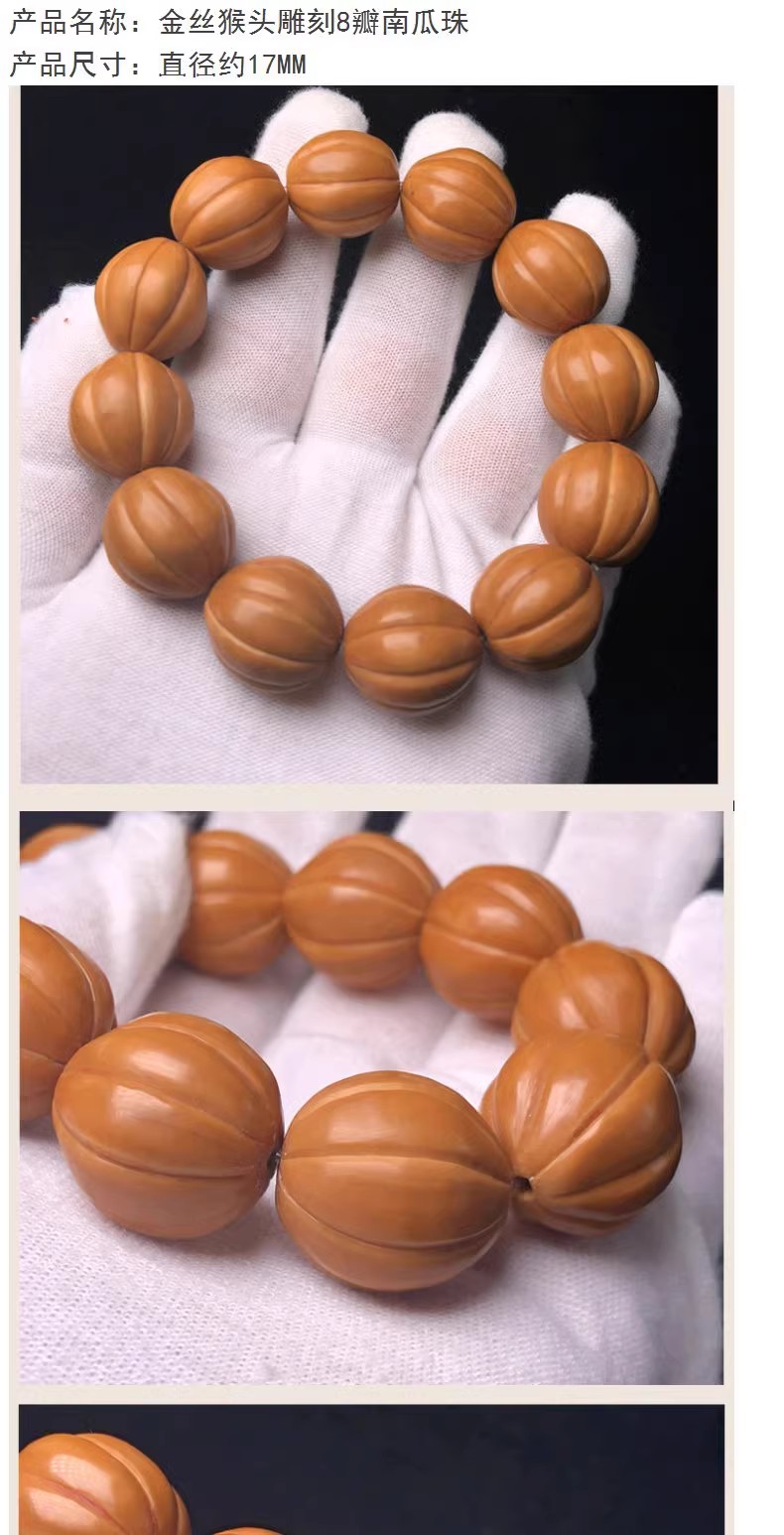 这款金丝猴头雕刻八瓣南瓜珠手串,经过全手工雕刻,每个珠子都呈现出独特的纹理和形状。孔道端正,使得手串整体更加美观大方。南瓜珠的造型独特,具有很高的观赏价值。