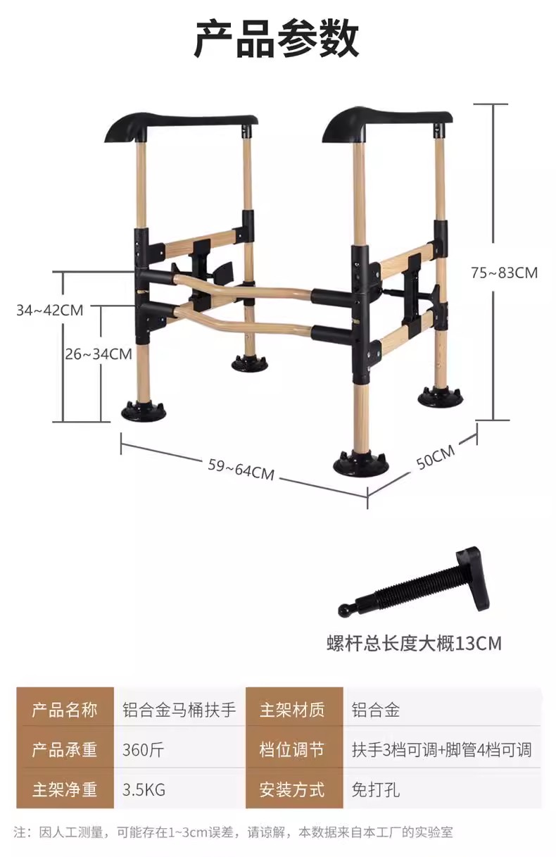 旋转夹片设计使得扶手架能够紧紧贴合马桶的弧度,即使是在使用过程中也不会松动。这种稳定性对于用户来说非常重要,特别是对于那些需要借助扶手支撑才能使用马桶的人来说更是必不可少。扶手脚管的高度和角度都可以调节,以适应不同身高的用户。