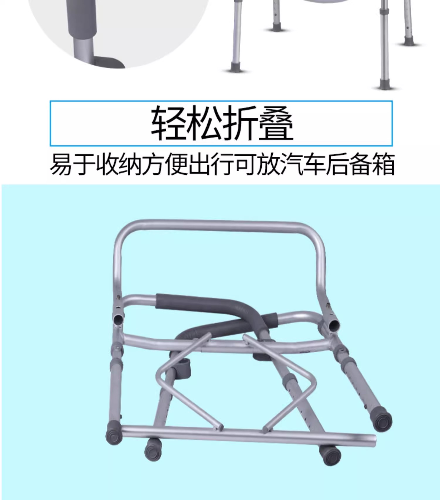 这款坐便椅是一款非常实用、多功能、可折叠、可移动的辅助器具,采用铝合金材质,轻便易用。它的设计旨在为那些腿脚不便、行动不便或需要帮助的老年人提供方便和舒适,可以在医院、家庭等场所使用。