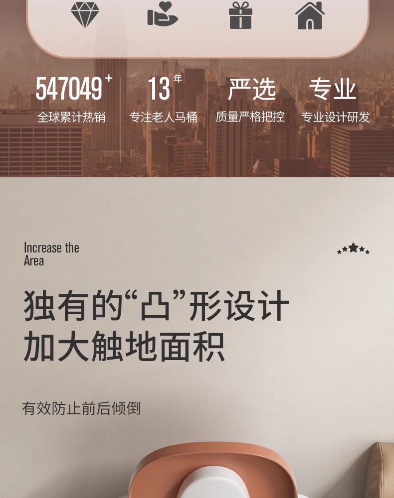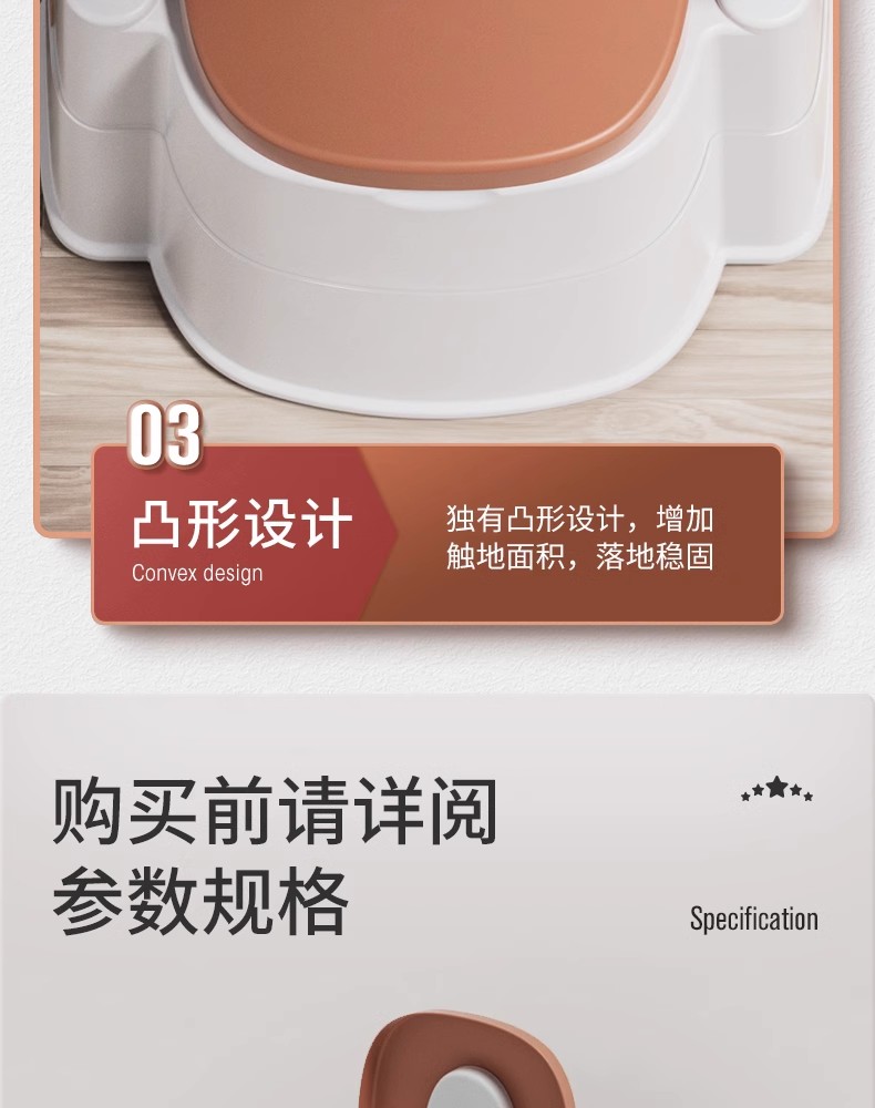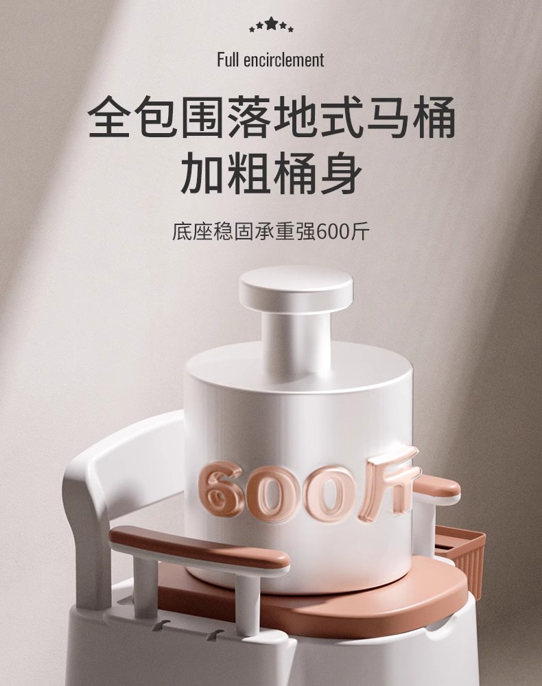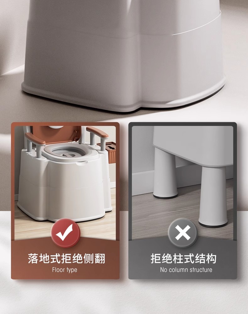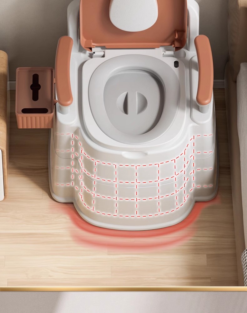 这款坐便椅是一款专为老年人设计的床边马桶,其独特的凸形设计和大触地面积能够提供更加舒适和安全的坐姿。全包围落地式马桶和加粗桶身的设计增加了稳定性和承重力,使得老人使用时更加放心。