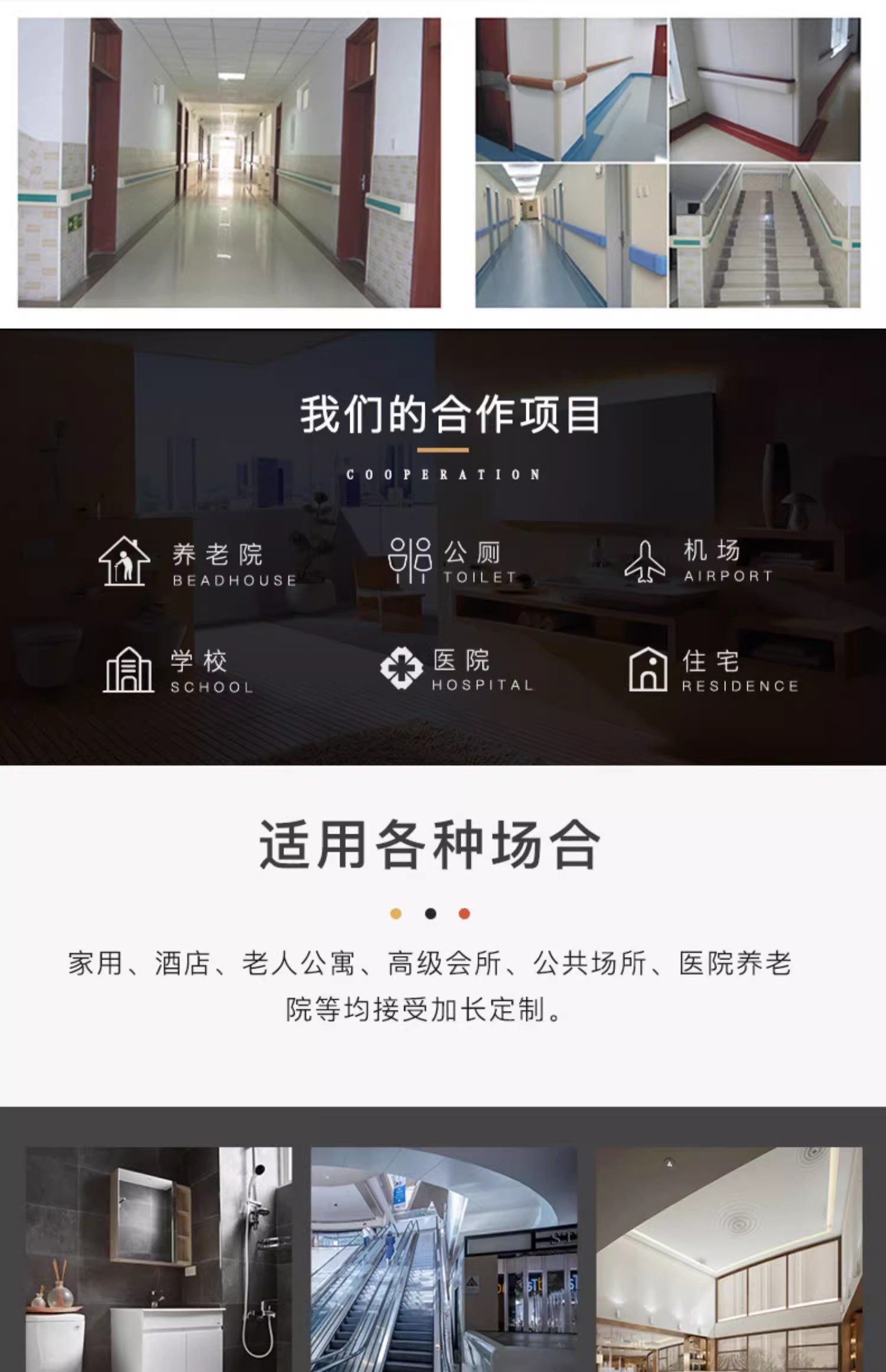 这款一字扶手非常实用,不仅适用于家庭,还适用于酒店、老人公寓、高级会所、公共场所、医院养老院等多种场所。它的加长定制服务可以满足不同场所的需求,让使用者更加舒适和安全。