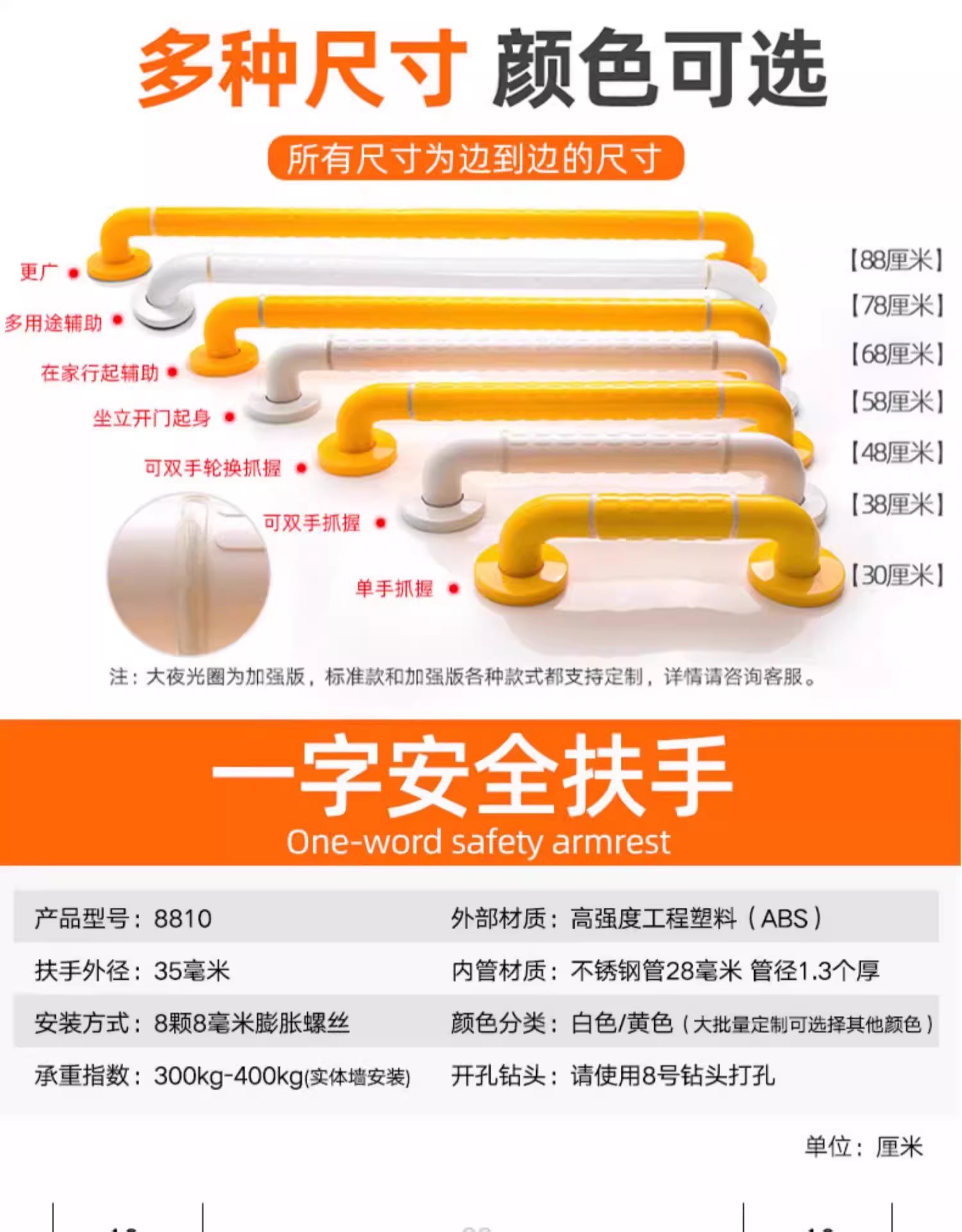 这款一字扶手的设计非常人性化,适用范围广泛,特别是对于老人和行动不便的人来说,它是一款非常实用的辅助器具。同时,它的加长定制服务和防滑颗粒把手设计也充分体现了对使用者的关心和呵护。