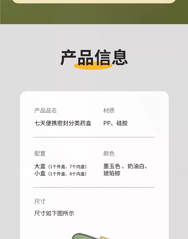 这款药盒采用三重密封装置,确保药品的安全和卫生。它还采用了硅胶防潮设计,可以有效地防止药品受潮,保证药品的质量和安全性。