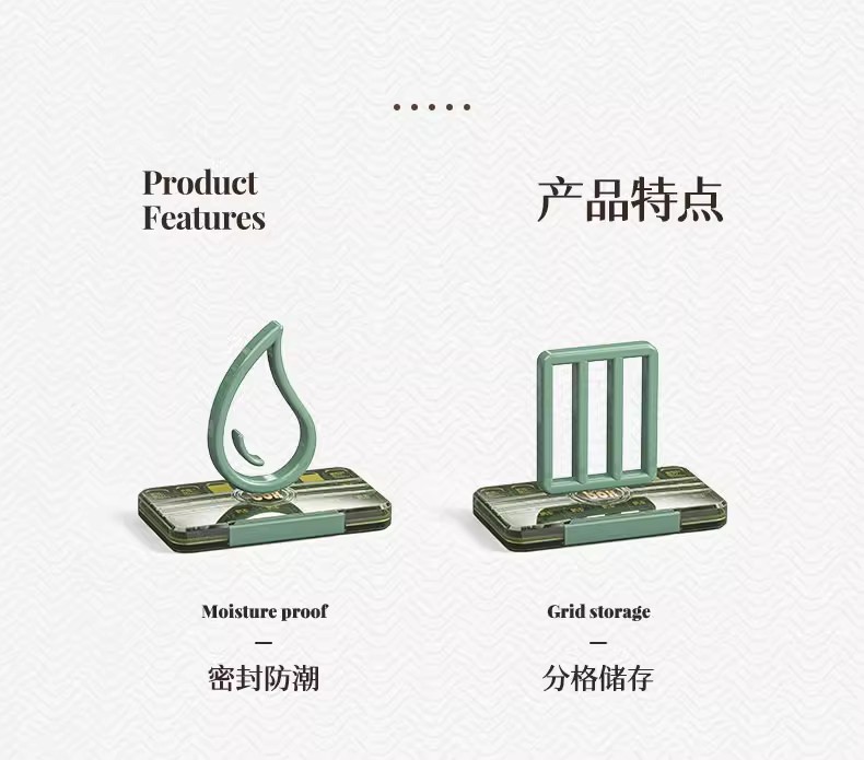 你是否正在为这样的问题烦恼,父母年迈总是忘记吃药,自己工作忙忘记吃药,药的种类太多,忘记吃药的剂量,外出时要带的药瓶太多?这款分格药盒能消除你所有的烦恼,七天分格设计,吃药不犯愁。