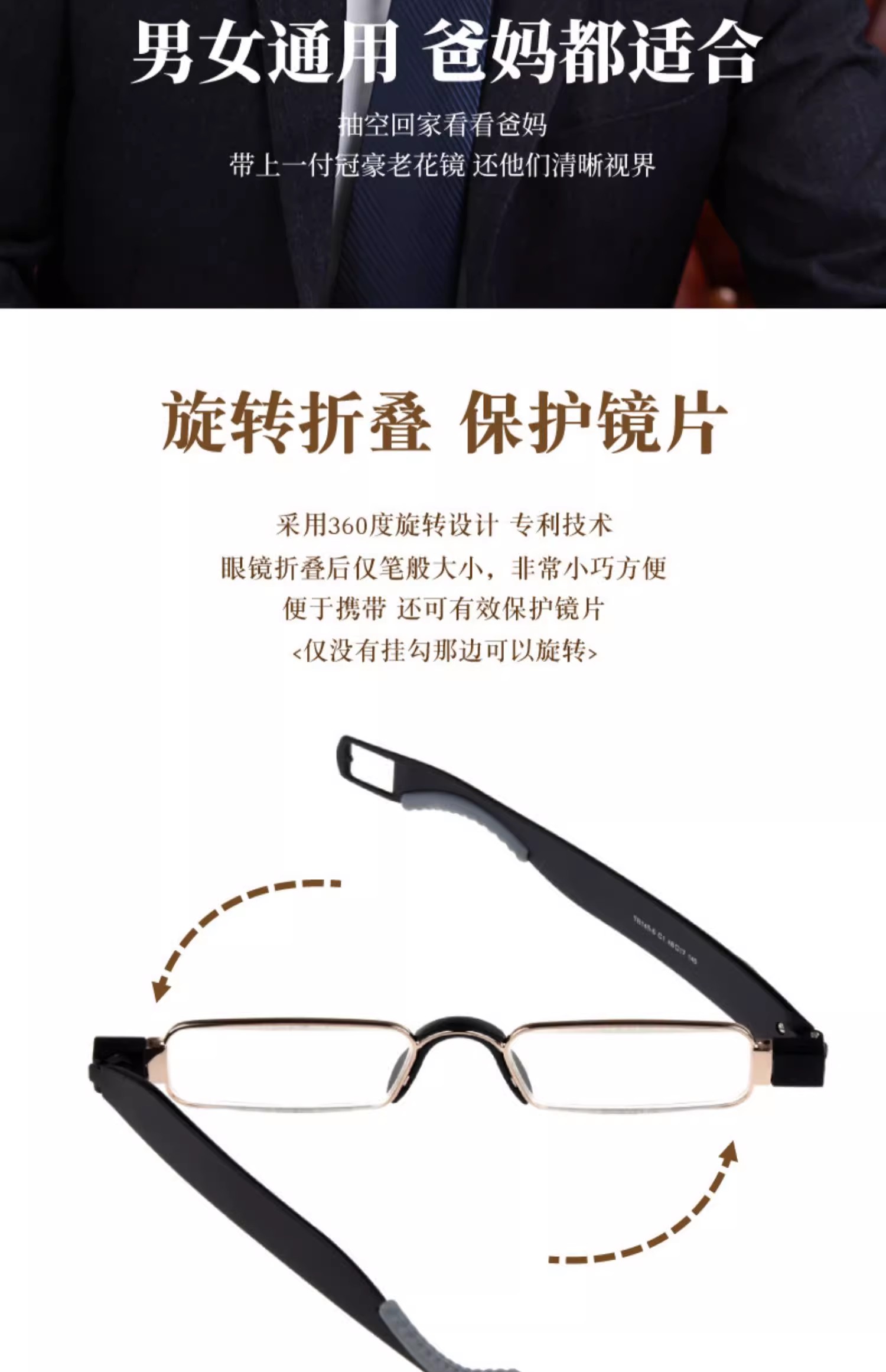 这款老花镜的设计独特,具有旋转折叠的功能,使得它非常方便携带和存储。高清镜片和进口材质保证了视觉质量和耐用性,而升级硅胶托叶则提供了更好的佩戴舒适度。这种设计使得老花镜不仅实用,而且时尚,男女都可以使用,也适合送给父母或长辈。