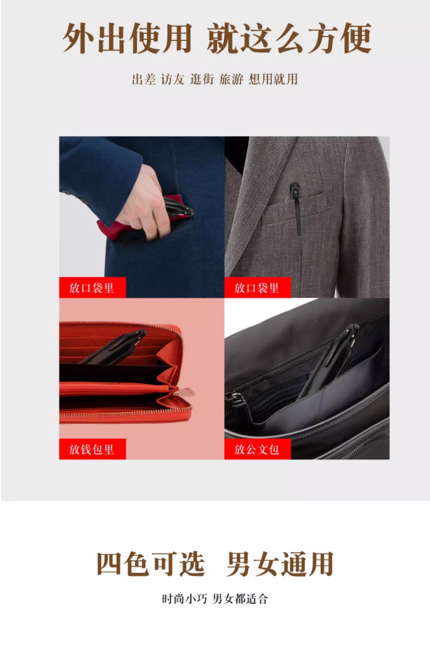 外观设计小巧,如同笔般大小,非常方便携带,无论是在外出购物、旅游还是办公时都十分方便。此外,它还有四种颜色可供选择,使得消费者可以根据自己的喜好和需求进行选择。