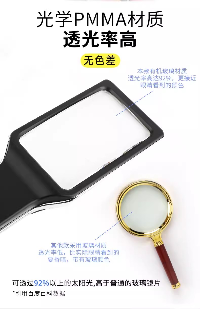 此外,这款放大镜使用的是光学玻璃材质,这种材质具有更高的透光率和更强的抗磨损性,可以更好地保护眼睛。同时,它还配备了LED灯辅助光源,这种光源非常柔和,不会刺眼,让使用者可以在任何光线条件下都能舒适地进行阅读或观察。