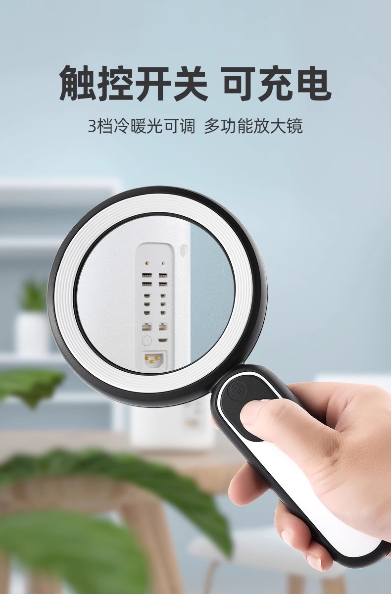 触控开关的设计使得操作更加方便和准确,可充电功能则能够让您在没有电源的情况下也能使用,三档冷暖光可调则能适应不同的光线环境,提供更加舒适的视觉体验。这款多功能放大镜具有多种实用的功能和特点,是一款非常优秀的工具。