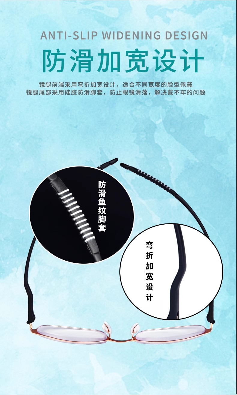 这款防蓝光老花镜的设计非常出色,它采用了金属镜框,不仅外观时尚,而且超轻舒适,让佩戴者几乎感觉不到它的存在。更值得一提的是,它采用了无螺丝结构,有效防止了因螺丝脱落、螺丝难以找到而使眼镜无法使用的情况发生。这个独特的设计不仅提高了眼镜的耐用性,也解决了很多人因为螺丝问题无法使用眼镜的困扰。