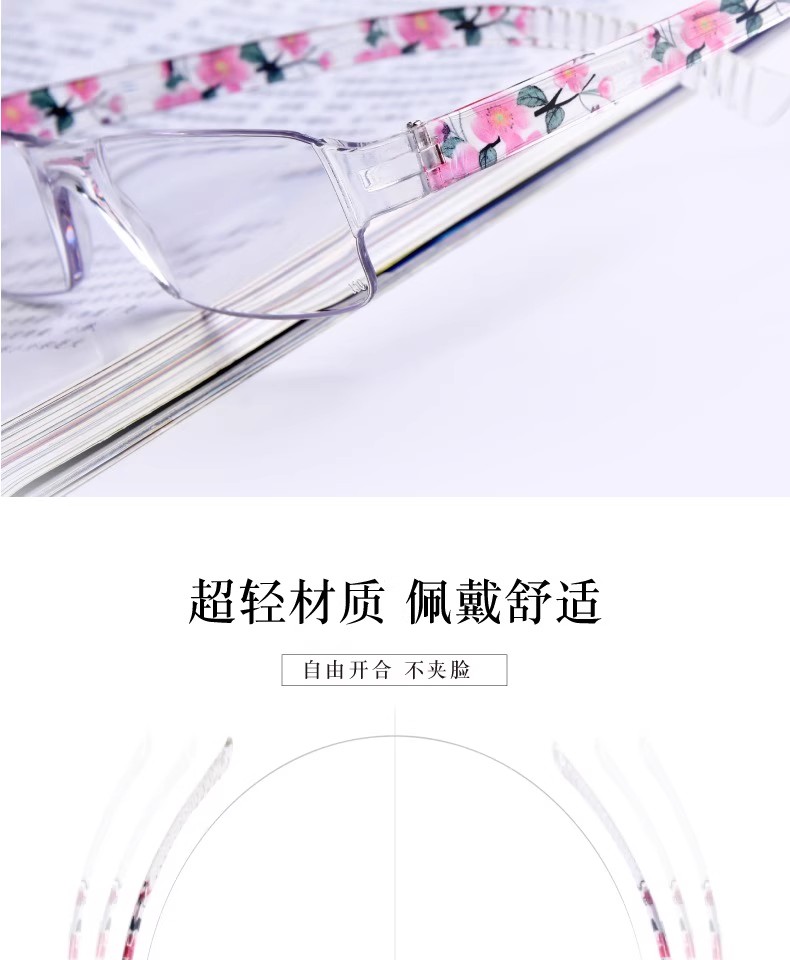 这款老花镜的超轻材质使得佩戴更加舒适,不会对脸部造成任何负担。它的自由开合设计也使得佩戴更加方便,不再夹脸。此外,它的贴近真实色彩的设计也让您在佩戴老花镜时能够更加清晰地看到物品的真实颜色。